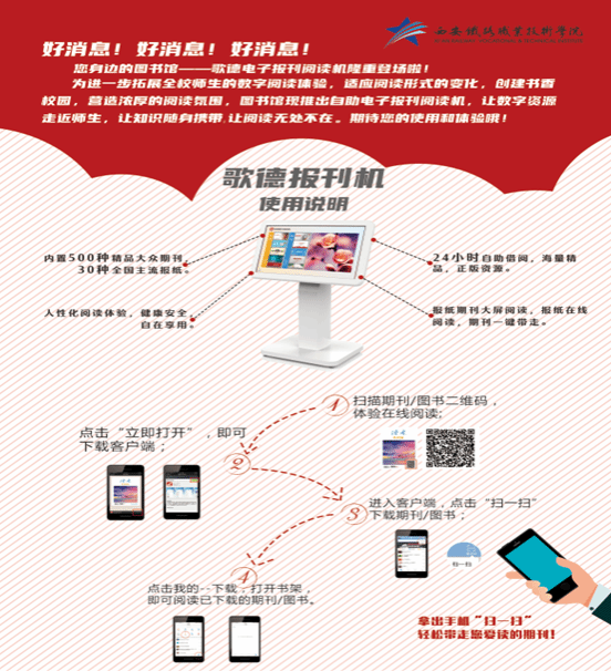 报刊阅读机是集“传统文化与现代技术、全民阅读与文化服务”为一体的24小时自助服务型智慧文化产品,内置500种精品大众期刊,30种国内主流报纸,视频400余集,每月期刊更新150本,支持在线阅读和扫码下载带走阅读两种方式。