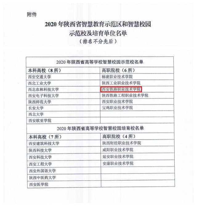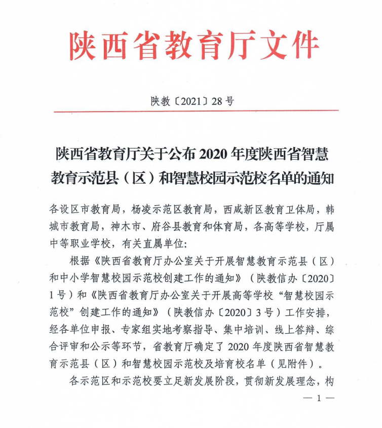 近日,陕西省教育厅发布了《关于公布2020年度陕西省智慧教育示范县(区)和智慧校园示范校名单的通知(陕教【2021】28号)》,纽约国际官网荣获“陕西省高等学校智慧校园示范校”称号。