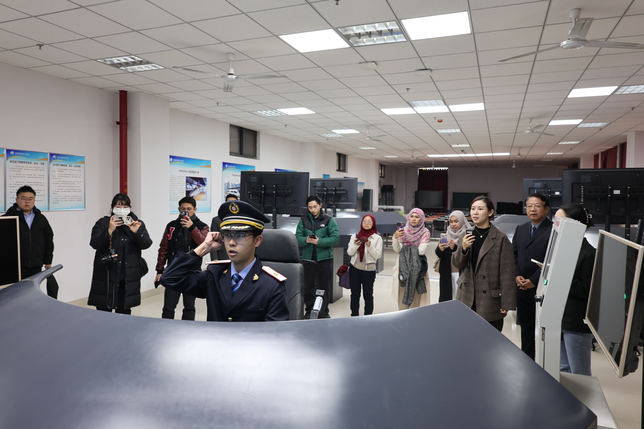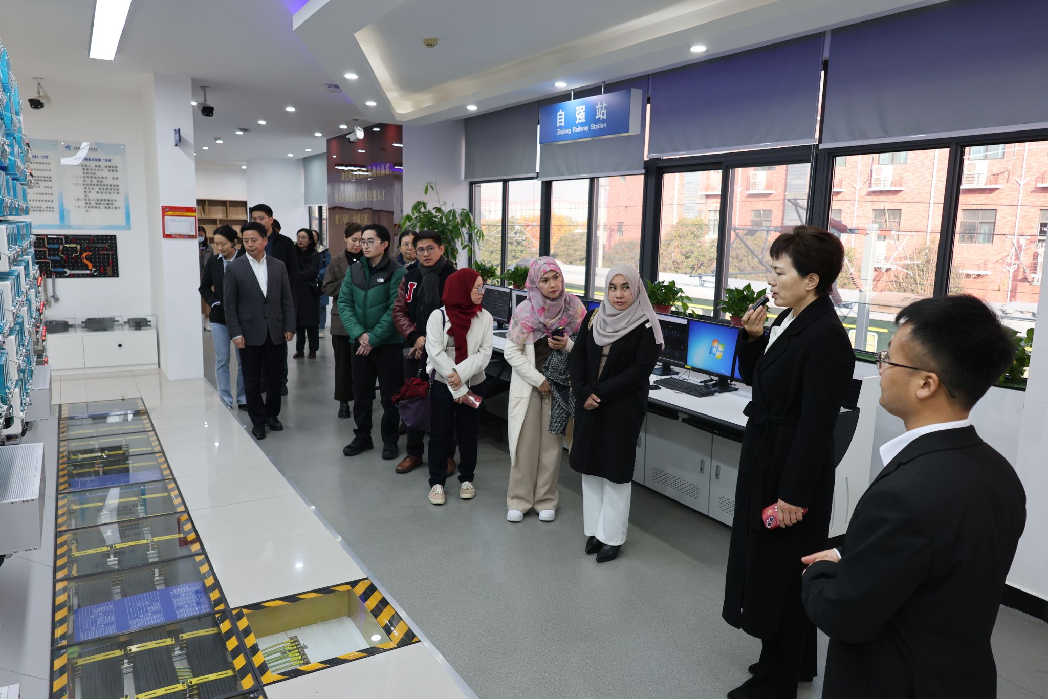 文莱政府青年官员代表团一行参观了高速铁路运行控制技术实训中心的机械信号室区、调度中心区、考核站点和多媒体教室区。该中心配套现场实际设备和虚拟实训设备,完整再现高铁信号运行的全部过程。