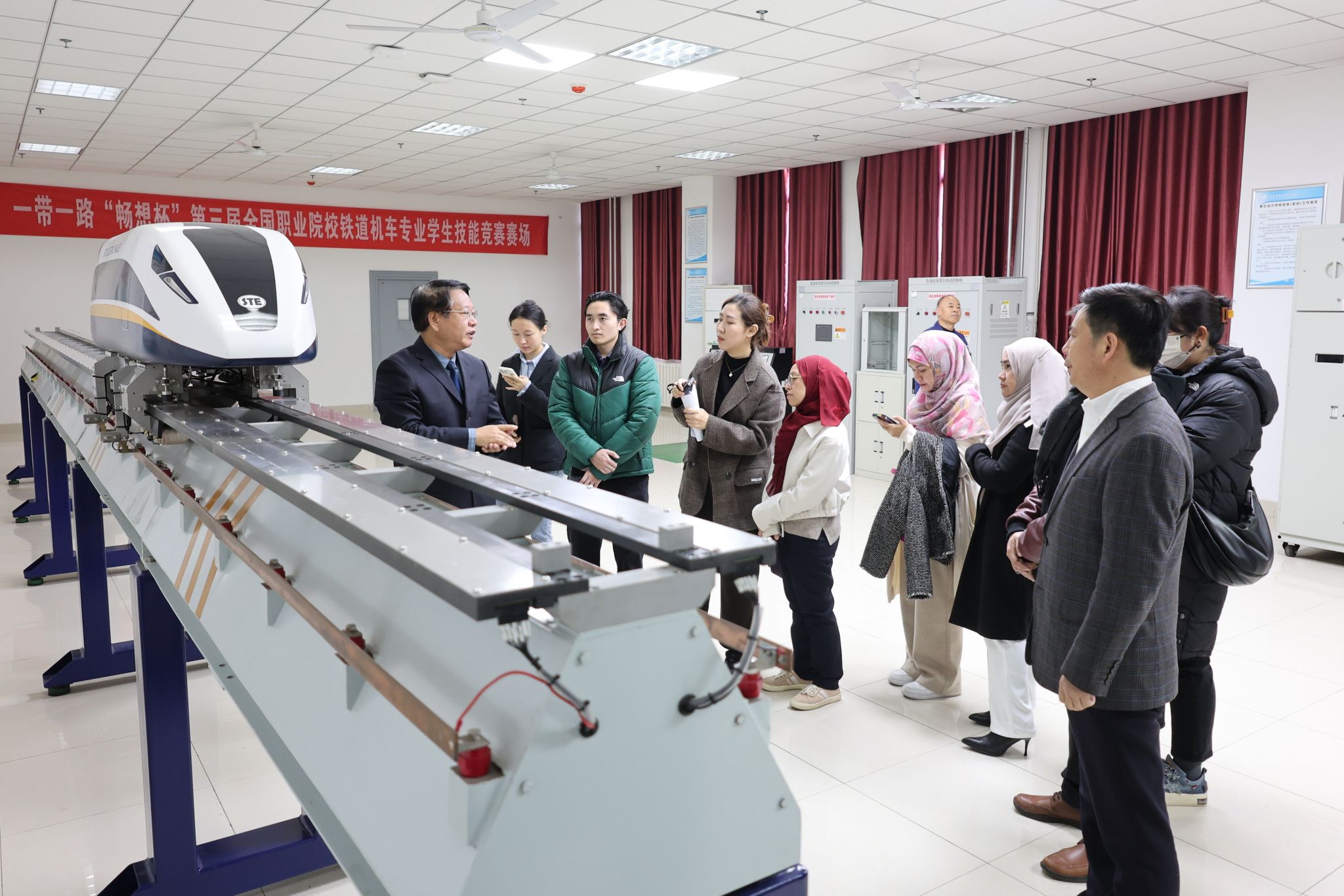李益民带领外宾参观了实训室内精密的设备及磁悬浮列车模拟操作实验室,详述了中国高铁技术发展的情况。