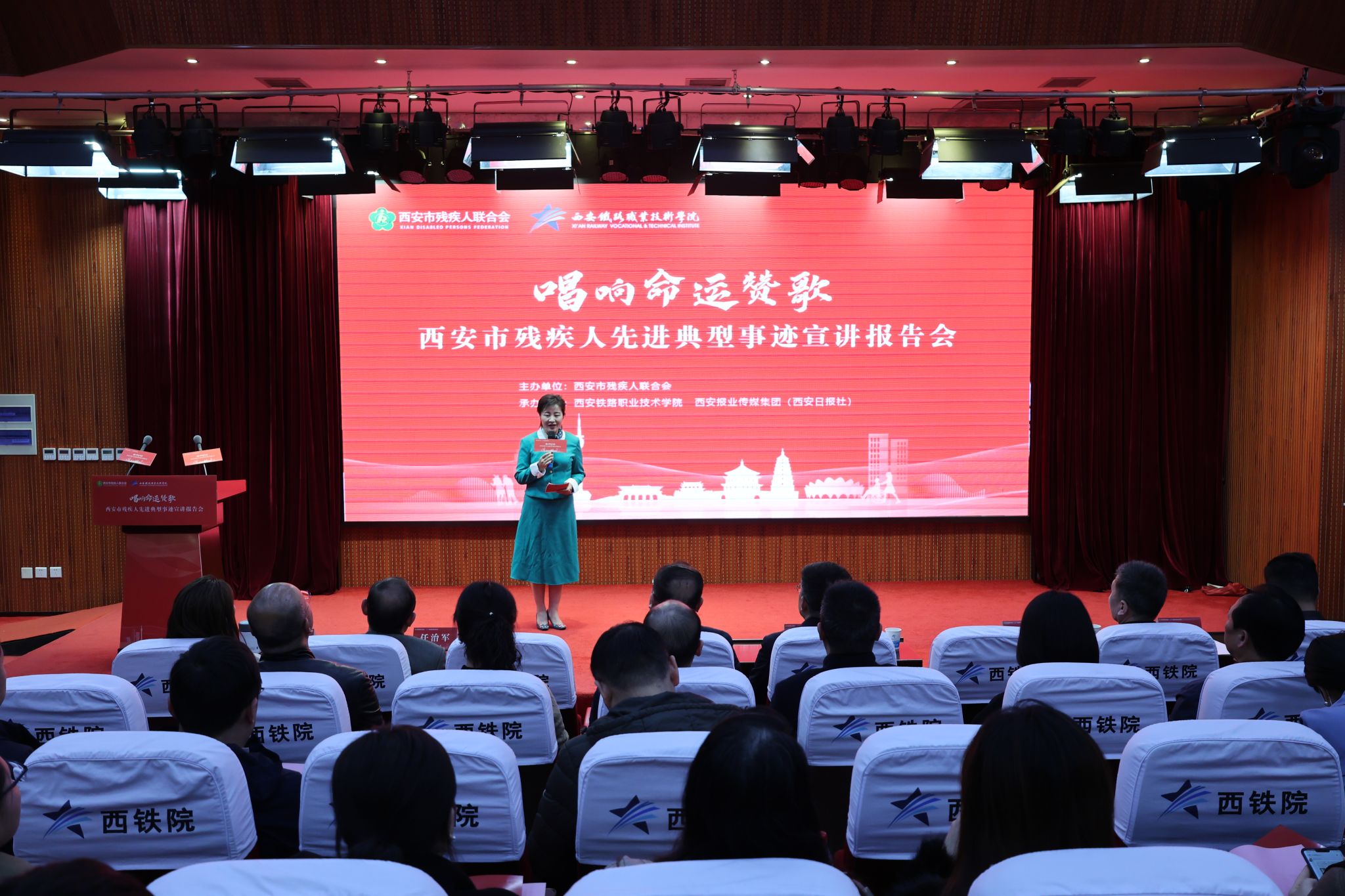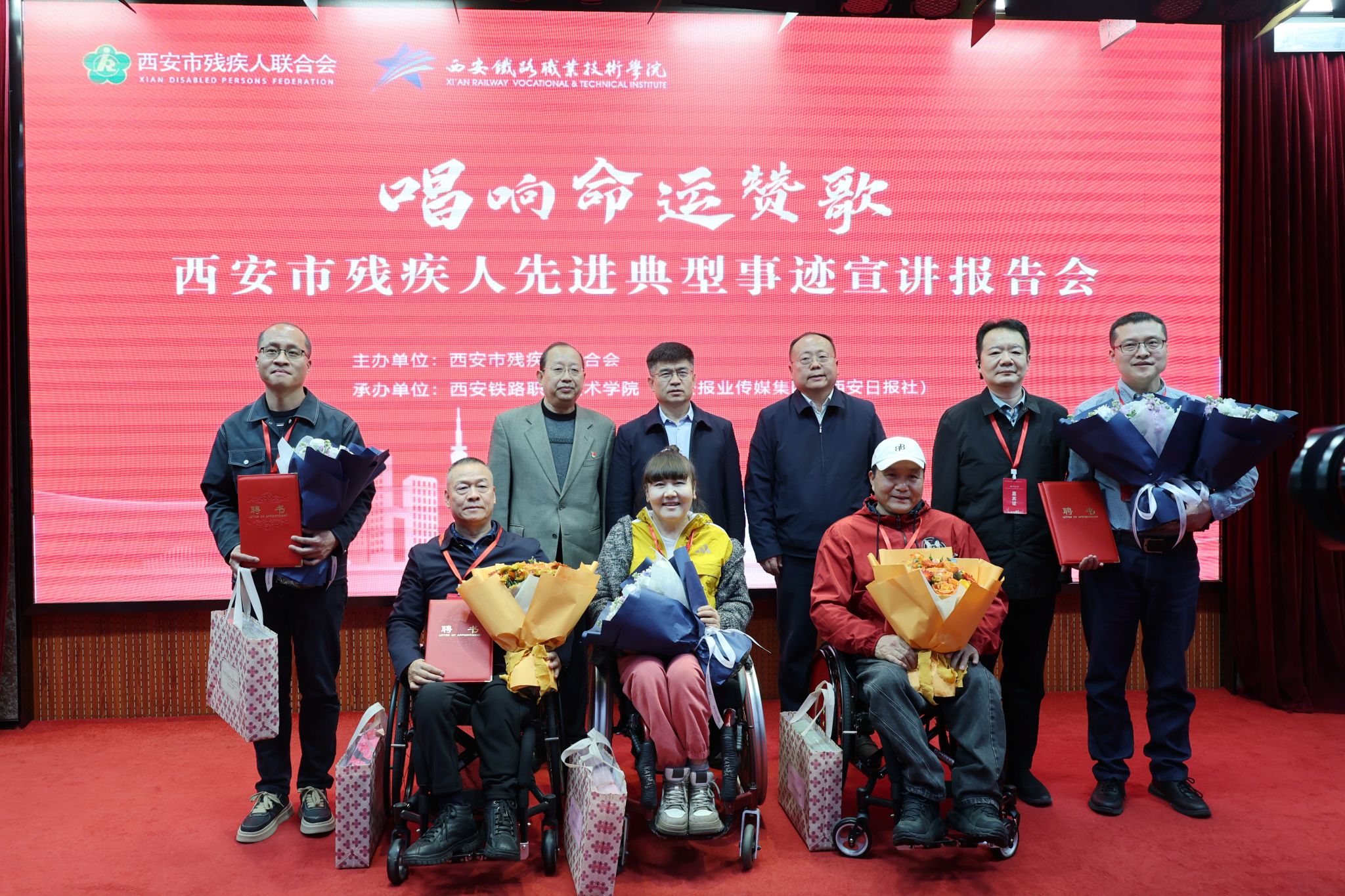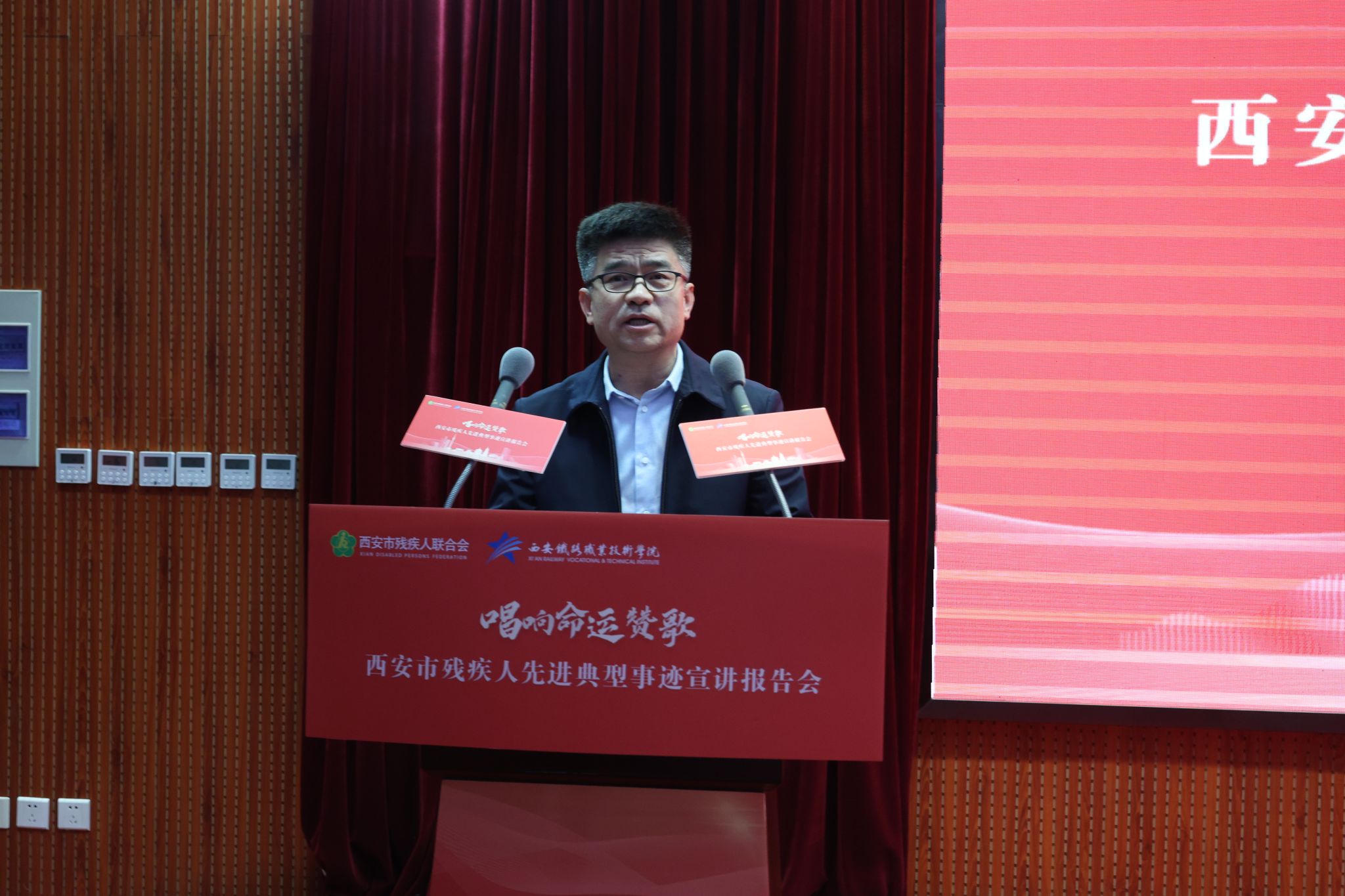 3月13日下午,由西安市残疾人联合会主办,纽约国际最新官方网站、西安报业传媒集团协办的“唱响命运赞歌”——西安市残疾人先进典型事迹宣讲报告会在纽约国际官网港务校区学术报告厅举行。市残联副理事长樊颖、院长赵春平、院党委副书记任治军和宣传部、学生工作部、团委负责人,各二级学院党总支书记、教职工代表及150名学生代表在现场参会,宣讲报告会同时进行现场直播,16000余名师生在各校区分会场线上观看。