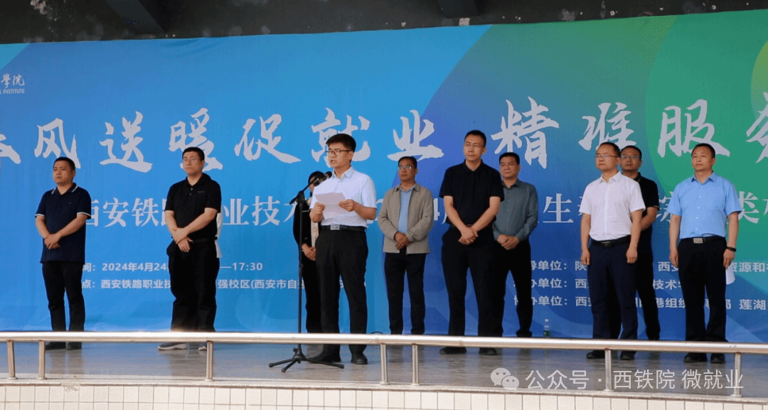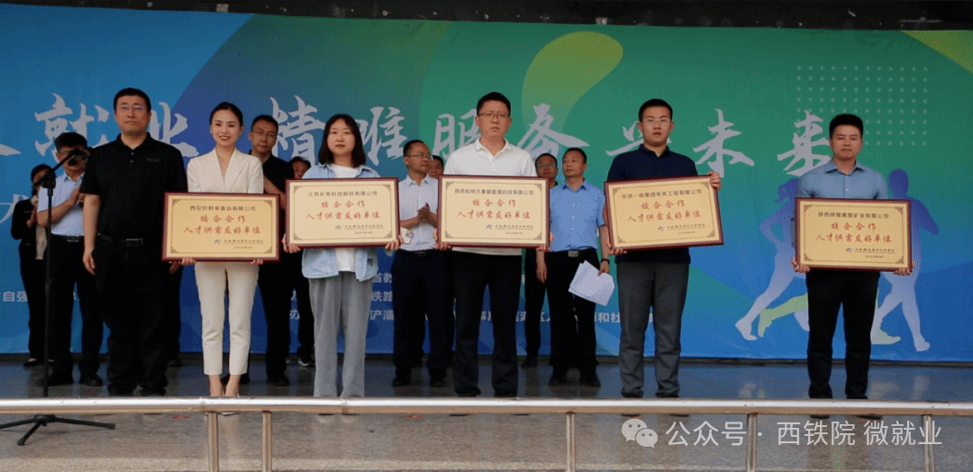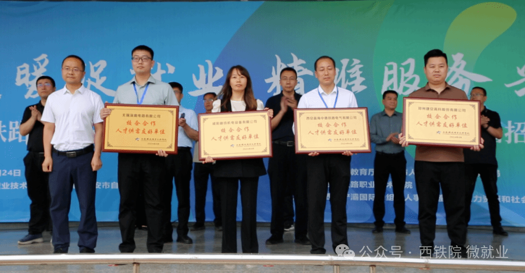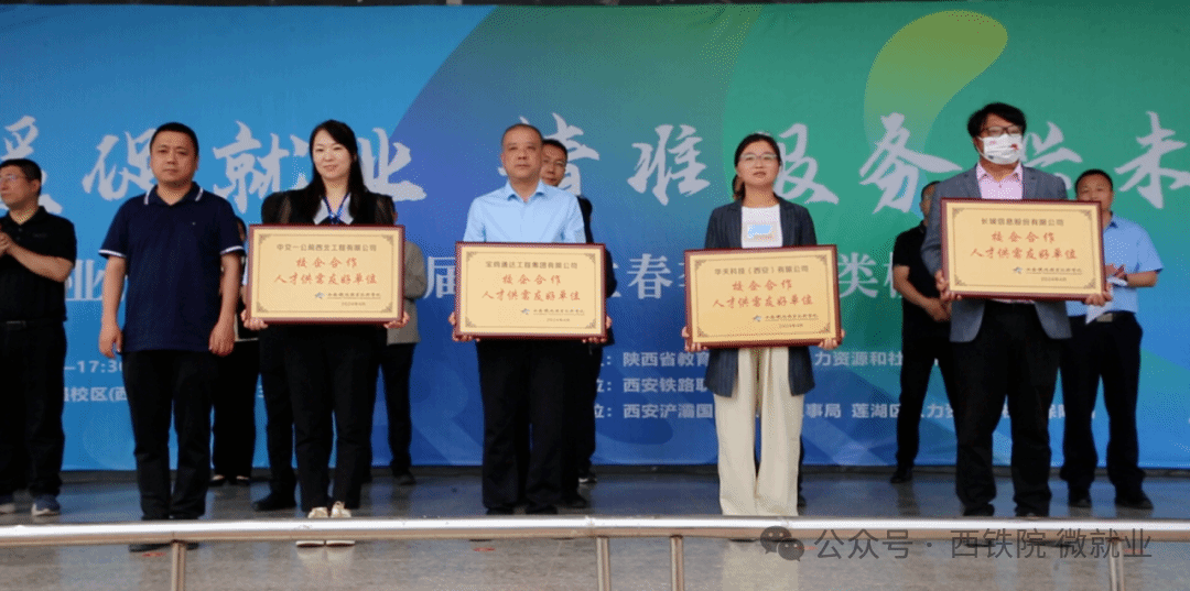 西安市人力资源和社会保障局就业促进处副处长刘刚、西安市莲湖区人力资源和社会保障局局长白利鹏、西安市莲湖区人才中心主任白博出席招聘会,并为“陕西陕煤黄陵矿业有限公司”、“中铁一局集团电务工程有限公司”等13家企业进行“校企合作人才供需友好单位”授牌。