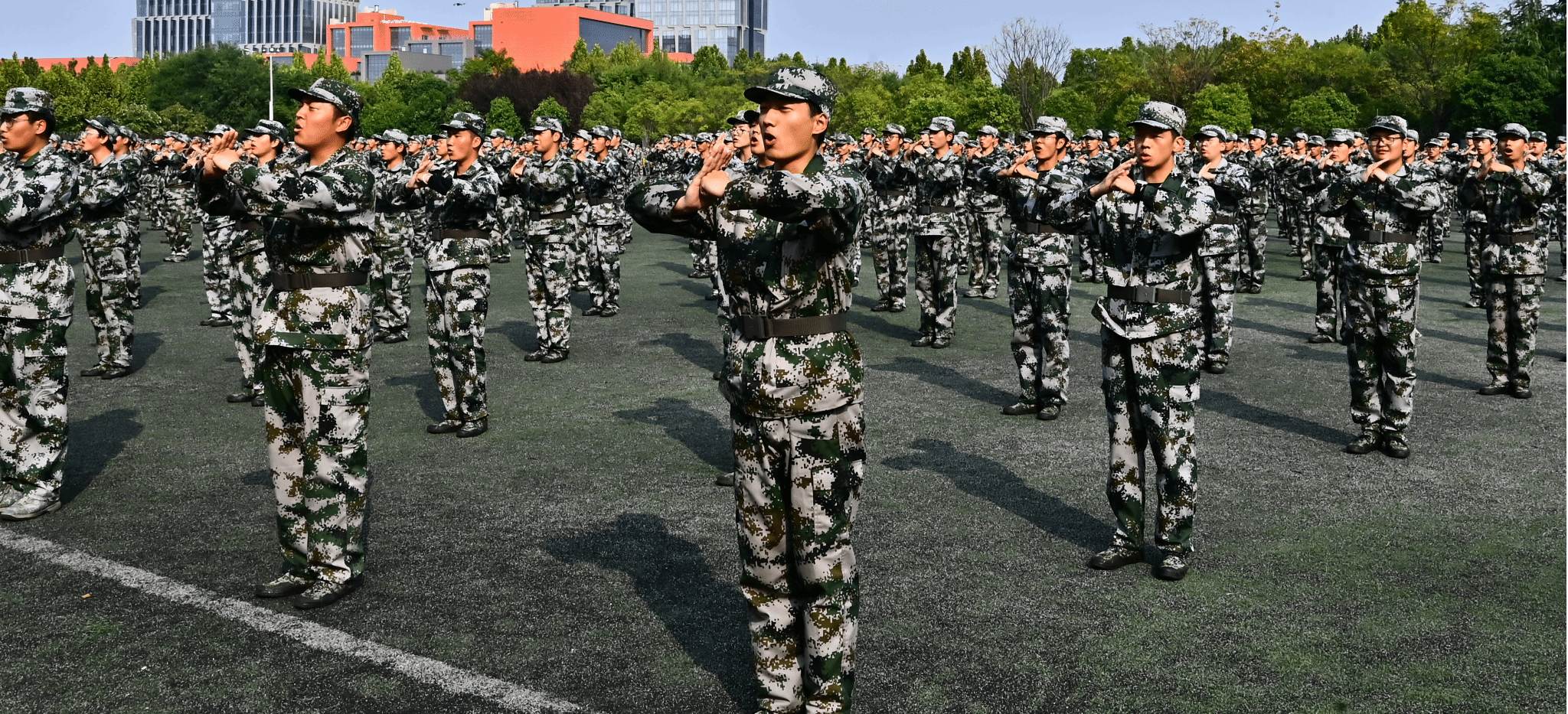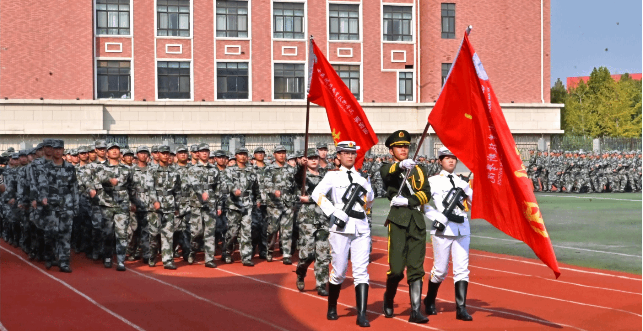 大会首先进行了军训成果汇报。军训团各营在总教官白小刚的指令下,国旗护卫队和四个二级学院组成的26个阅兵方阵,迈着整齐的步伐,喊着嘹亮的口号,依次齐步、跑步通过主席台接受检阅。他们以雄姿勃发的豪迈气势展示了刻苦拼搏的军训成果,以蓬勃的青春朝气、靓丽的青春底色,展现出良好的军事素养和精神风貌,赢得了在场领导和师生的阵阵掌声。