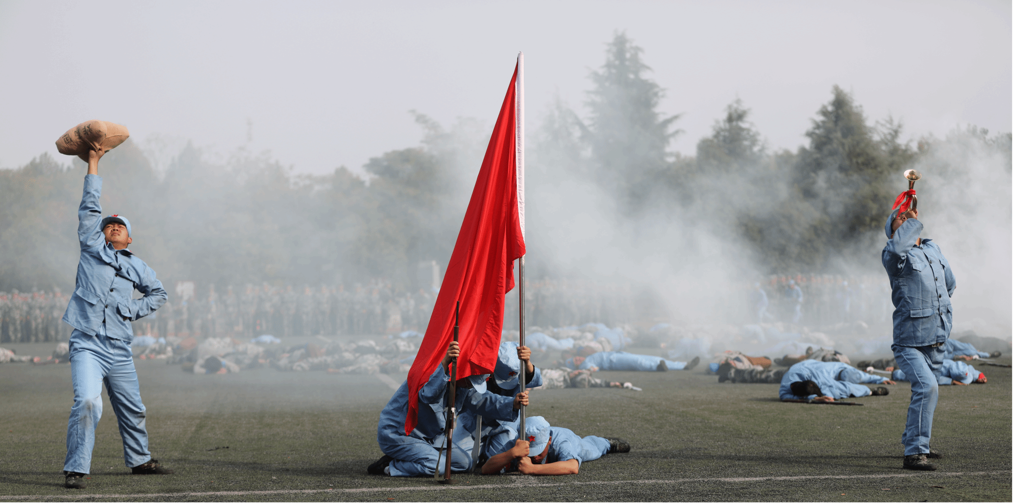 军训成果展示环节,新生们在安全演练、军体拳、擒拿格斗等项目中,训练有素、果敢勇毅、激扬青春、气势如虹。花样方队的表演中,同学们配合默契,灵活自如,不停的变换手中的红色方块,拼出“听党话、感党恩,学习二十大、永远跟党走、奋进新征程,请党放心、强国有我”等造型,震撼全场;情景剧《奋斗中的征程》,更是让党史教育“活”起来,使师生从建党伟业中汲取不断前行的智慧和力量。