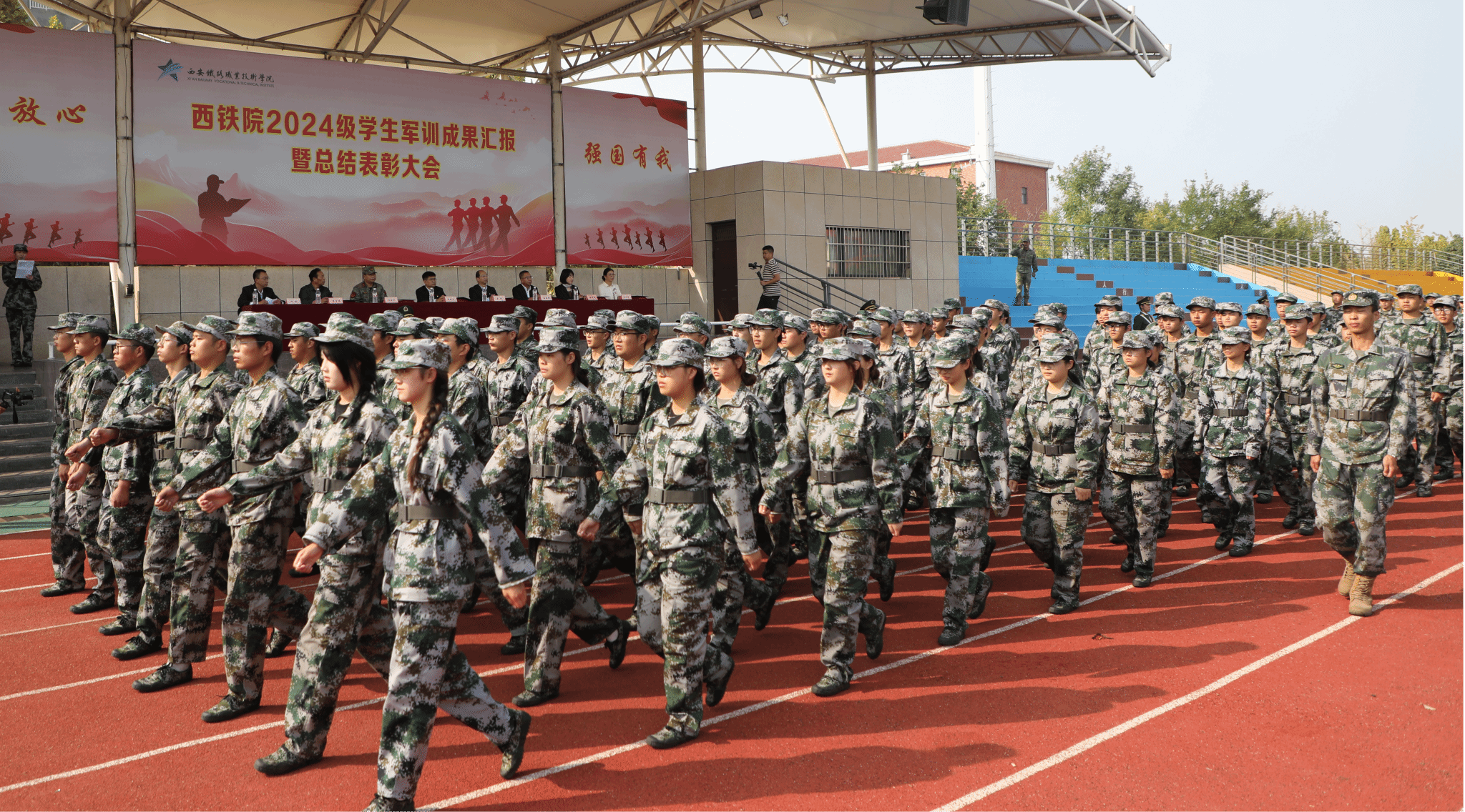 赵春平作总结讲话。他首先向承担本次军训任务的全体教官表示衷心感谢,向所有受训的新生表示热烈祝贺。他指出,在成果汇报中,同学们用严整的军姿、高昂的士气,充分展现了青春的朝气和锐气。通过军训同学们坚定了爱国主义信念,厚植了爱国主义情怀,用实际行动践行了“请党放心、强国有我”的青春誓言,为“大学第一课”交上了完美答卷。