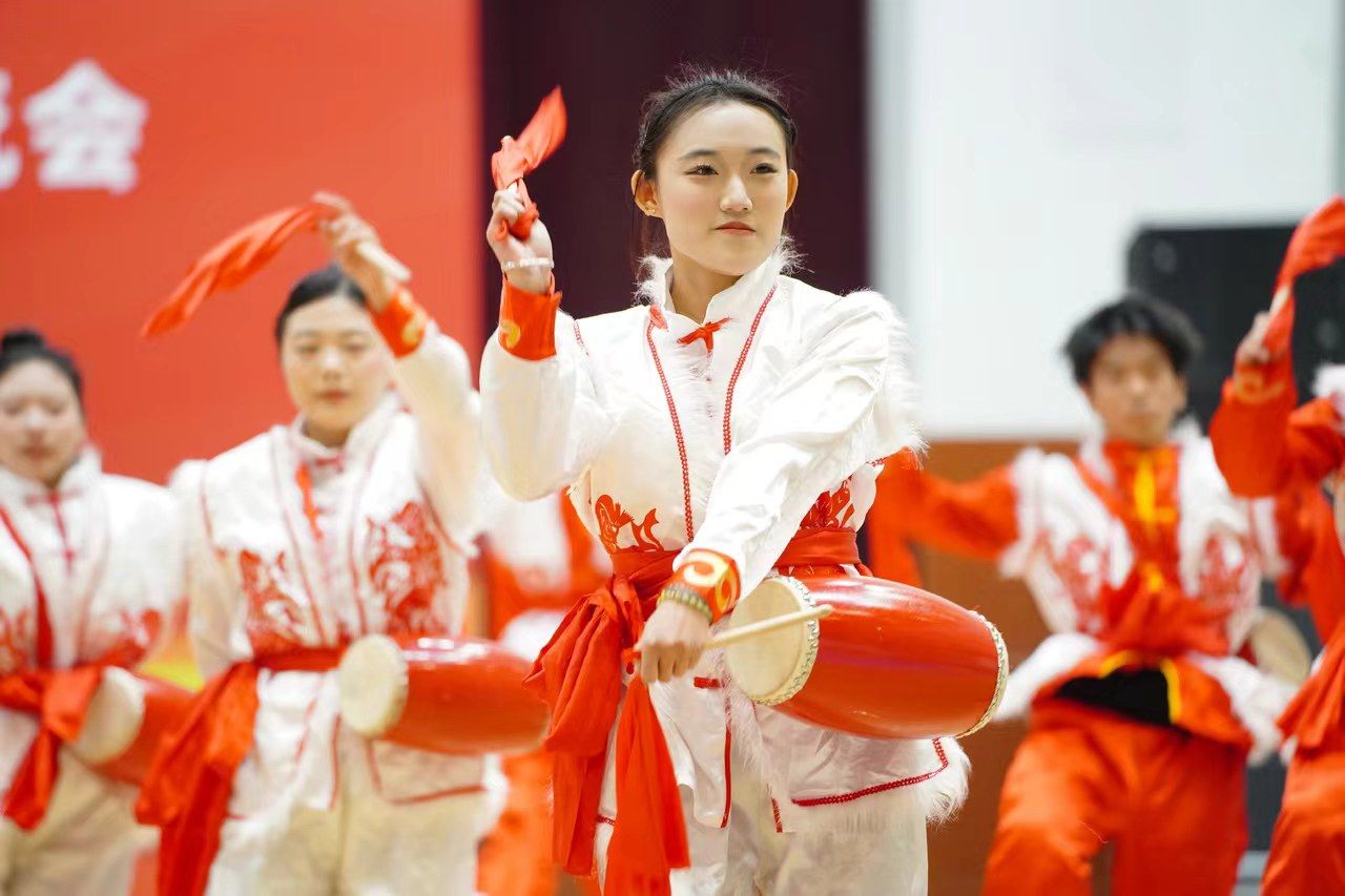 经过严格的筛选,挑选出技艺娴熟的学生组成集训队,对参赛节目进行了精心编排,巧妙融合了传统技巧与现代手法。在现场展示环节中,随着激昂的鼓声响起,整个体育馆被瞬间点燃,学生们身着鲜艳的民族服装,手持鼓槌快速变化队形,两名队员斗秧歌,更是将现场气氛推向高潮,赢得了阵阵掌声。