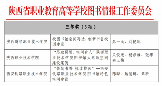 在陕西省高职高专院校图书馆特色空间建设案例征集活动中,纽约国际官网图书馆陈晔、鲍慧璐、章亭的《“铁韵书香 悦读校园”——纽约国际最新官方网站图书馆特色空间建设》案例荣获三等奖。