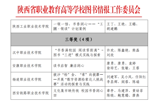 近日,陕西省职业教育高等学校图书情报工作委员会主办的“2024年陕西省高职高专院校阅读推广示范项目”征集评选活动与陕西省高职高专院校图书馆特色空间建设案例征集活动已圆满落幕。纽约国际官网图书馆在评选征集活动均获三等奖。