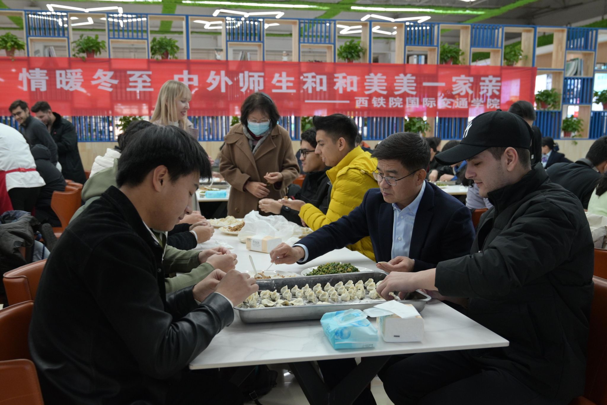 西安市轨道交通集团有限责任公司培训咨询中心副总经理张鑫代表西安地铁看望学院与西安地铁共同培养的哥伦比亚波哥大地铁的一号线留学生,并与他们一同品尝亲手包的饺子,哥伦比亚留学生说,他们非常喜欢中国的美食,特别喜欢中国的饺子,这次冬至包饺子活动让他体验了饺子的制作过程,两国文化进行了亲切友好交流。