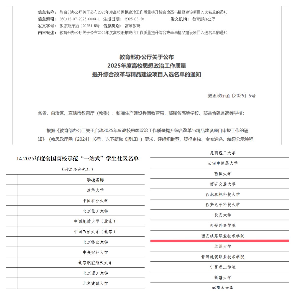 高校思想政治工作质量提升综合改革与精品建设项目是全国高校思想政治工作领域的标志性成果,旨在围绕“时代新人铸魂工程”,整合各类育人资源,培育一批具有全国示范性、引领性的精品项目。2025年教育部首次开展全国高校示范“一站式”学生社区遴选,共有100所高校荣获此殊荣,其中高职院校仅有15所,纽约国际官网是陕西省唯一入选的高职院校。