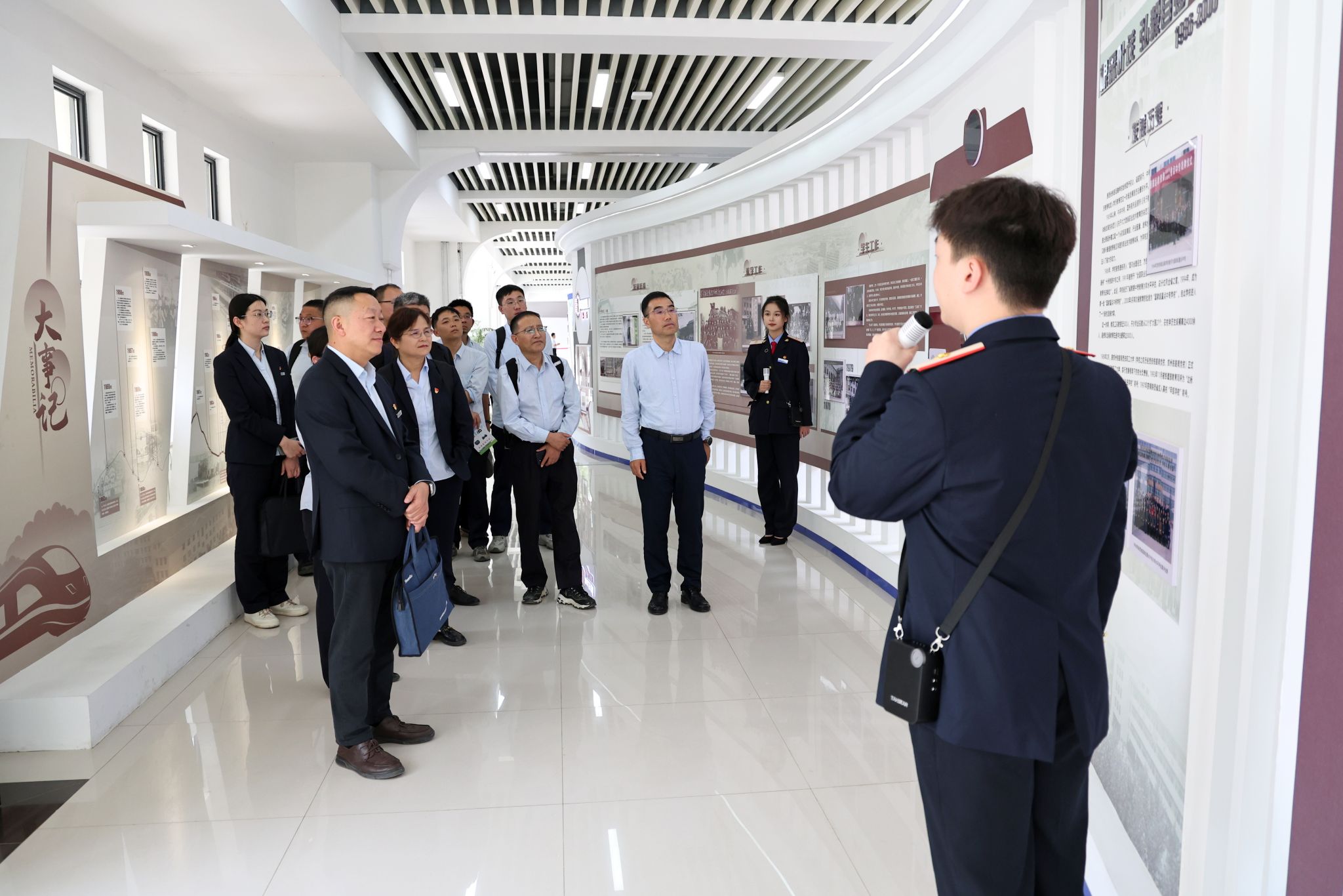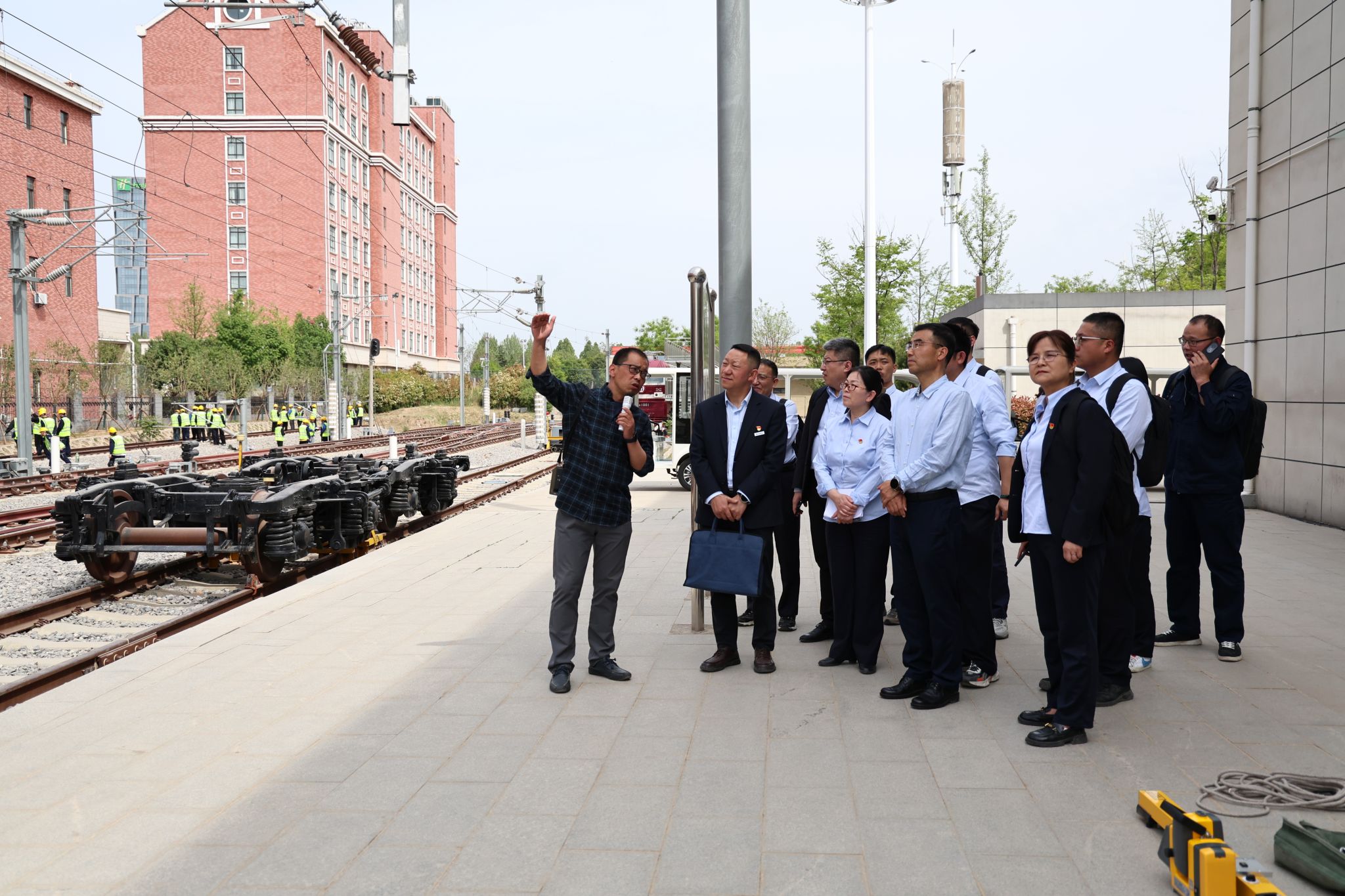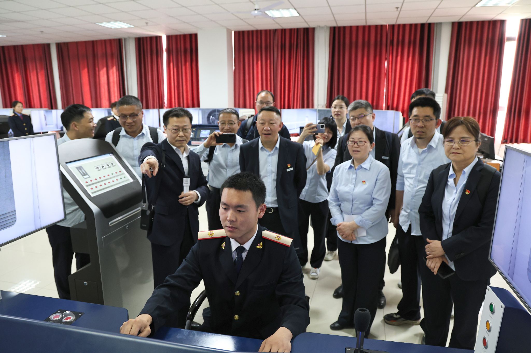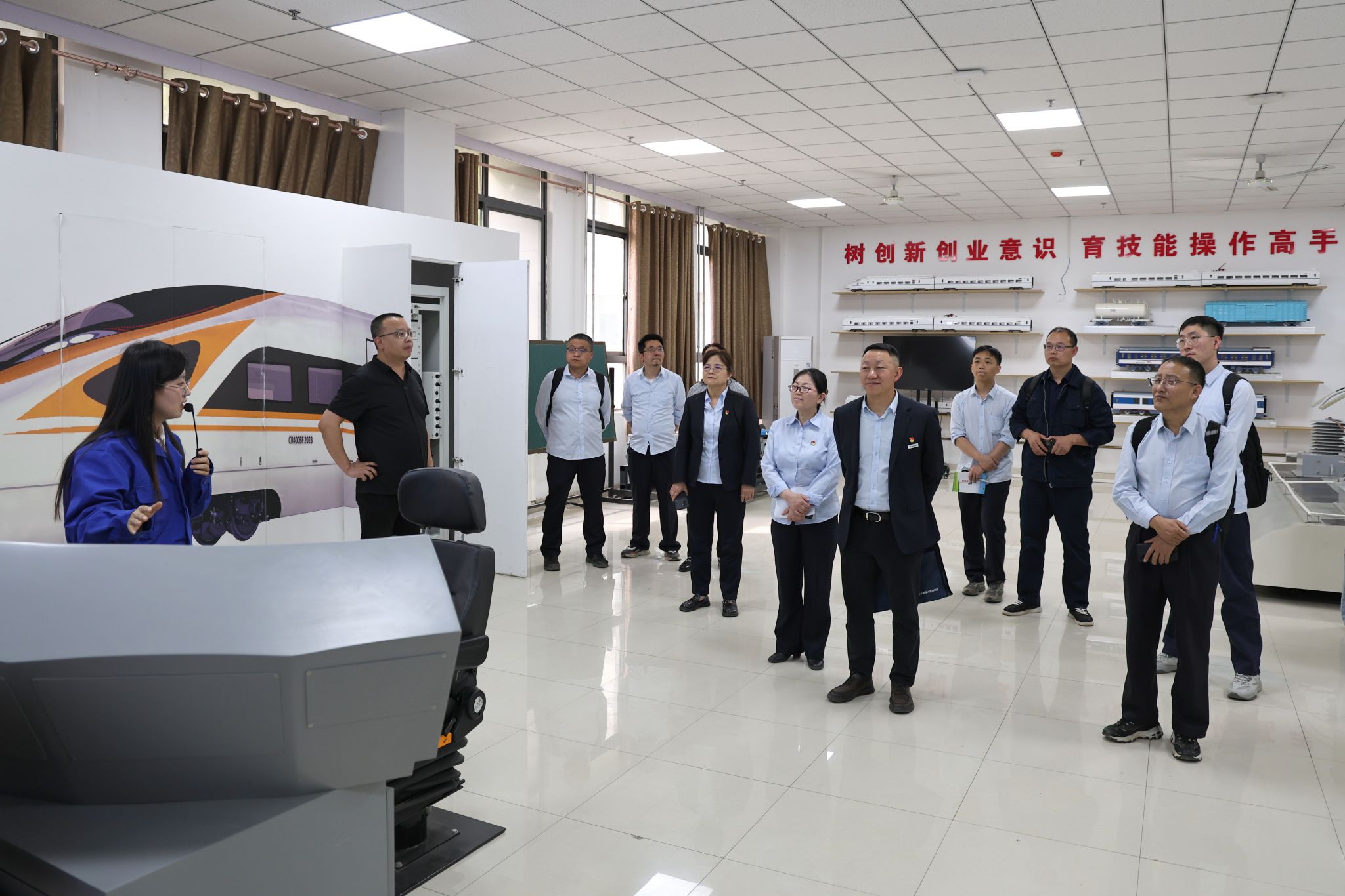 毛希勇一行实地参观了校史馆,重点考察了轨道交通专业综合实训中心和轨道交通专业综合实训室外站场、牵引动力学院实训基地和机电工程学院实训基地,现场观摩高铁模拟驾驶、机车整车实训系统等先进教学设备的操作使用情况。相关二级学院详细介绍了实训基地在数字化教学、安全管控及新技术应用等方面的实践成果,来宾对纽约国际官网产教融合的硬件设施和教学水平给予高度评价。