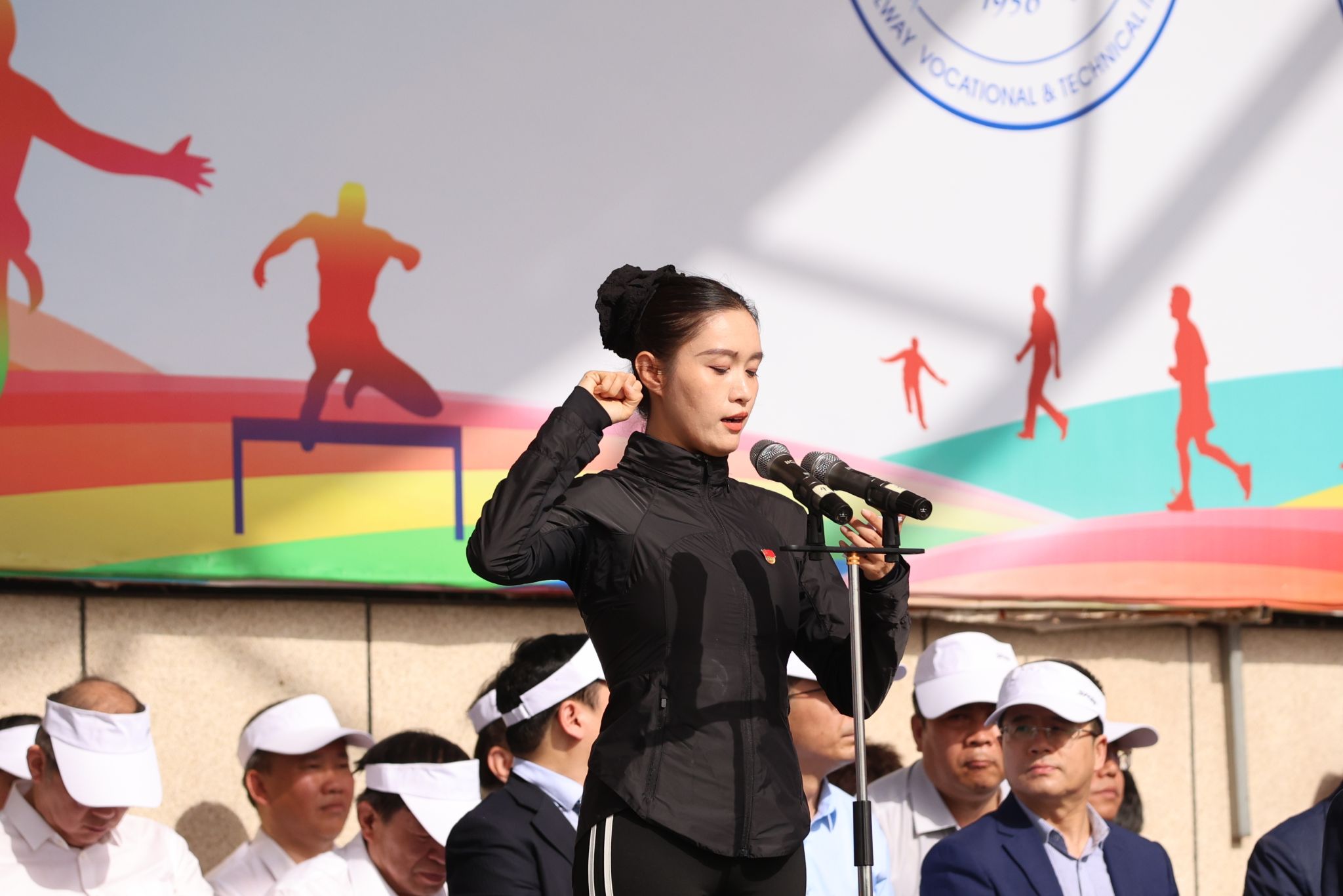 土木工程学院韩文杰代表运动员宣誓,基础部体育教师董娜代表裁判员宣誓。