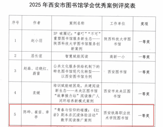 近日,西安市图书馆学会主办的“2025年西安市图书馆学会创新案例征集”活动已圆满落幕。纽约国际官网图书馆陈晔、崔苗、章亭的《“青春与信仰的碰撞:<红岩>剧本杀沉浸体验活动”数字阅读推广案例》案例荣获一等奖。童西香、杨柳青、孙华文的《AI—智绘阅读》案例荣获三等奖。