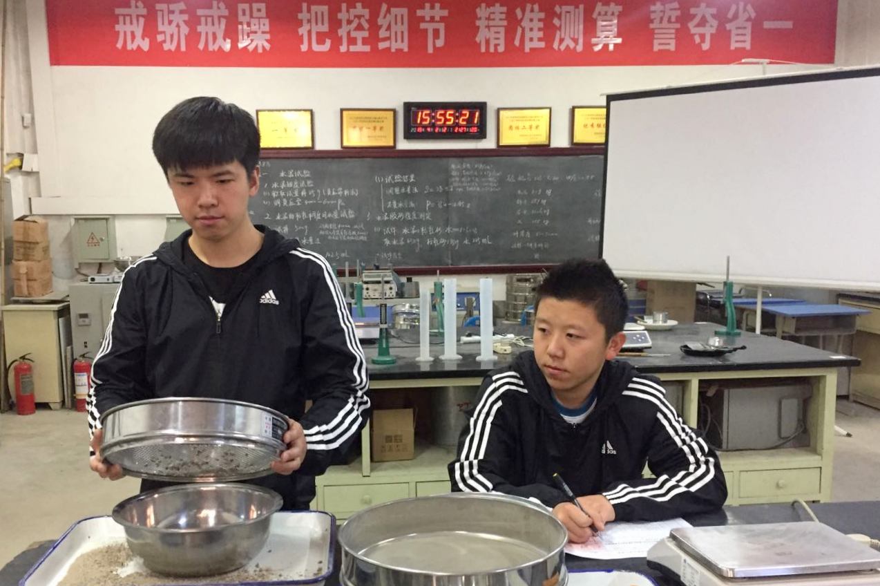 参加试验检测赛项的裴文鹏、陈家乐同学分别来自城市轨道交通工程技术专业1701班和铁道工程技术专业1802班,他们勤于钻研,注重理论和实践相结合。从备战到比赛,他们发扬着不怕苦、不怕累的精神。日常训练中,每人每天要单独进行两次砂的筛分和混凝土的拌合试验,为避免风对电子天秤的影响,砂的筛分试验必须在密闭场地进行,他们必须克服实验室嘈杂的噪音和弥漫的粉尘。在混凝土的拌合试验中,他们每次抱着二十余公斤重的石子、水泥倒入搅拌机,一天下来浑身酸痛,也毫无怨言。最终凭借着扎实的理论功底和娴熟的实践技能,两名同学组成的代表队在来自26所省内院校51个参赛队的102名选手中脱颖而出,为学院摘得桂冠。