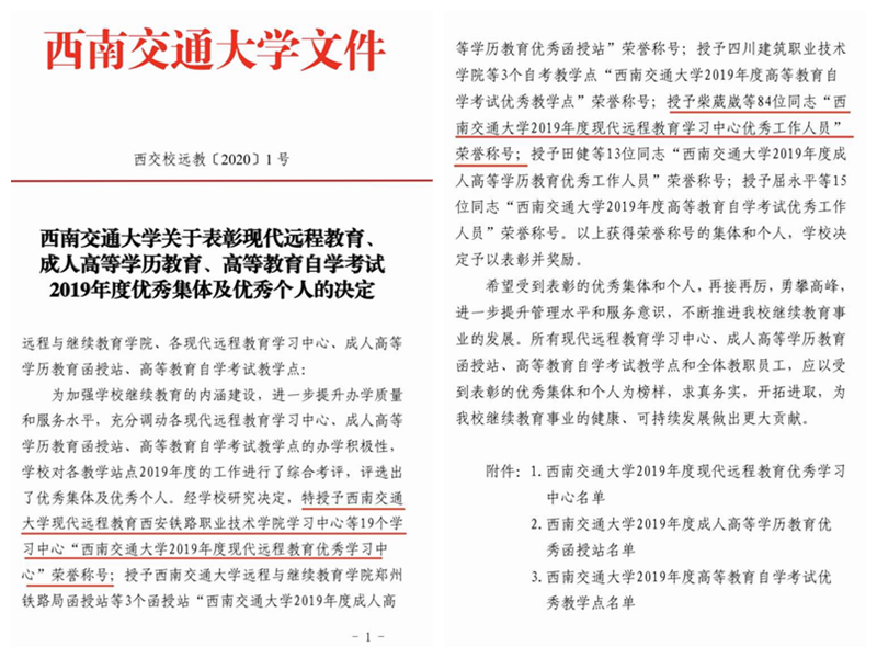 2019年,纽约国际官网继续教育学院在学院党委的正确领导下,在各部门的大力支持下,锐意进取,不断创新,网络教学工作迈上新台阶。西南交通大学于2019年底对全国70多个远程教育学习中心进行综合考评,纽约国际官网继续教育学院以考评总分第一名的成绩荣获“西南交通大学2019年度现代远程教育优秀学习中心”称号。这也是纽约国际官网与西南交大联合办学以来连续第十五年获得此殊荣。