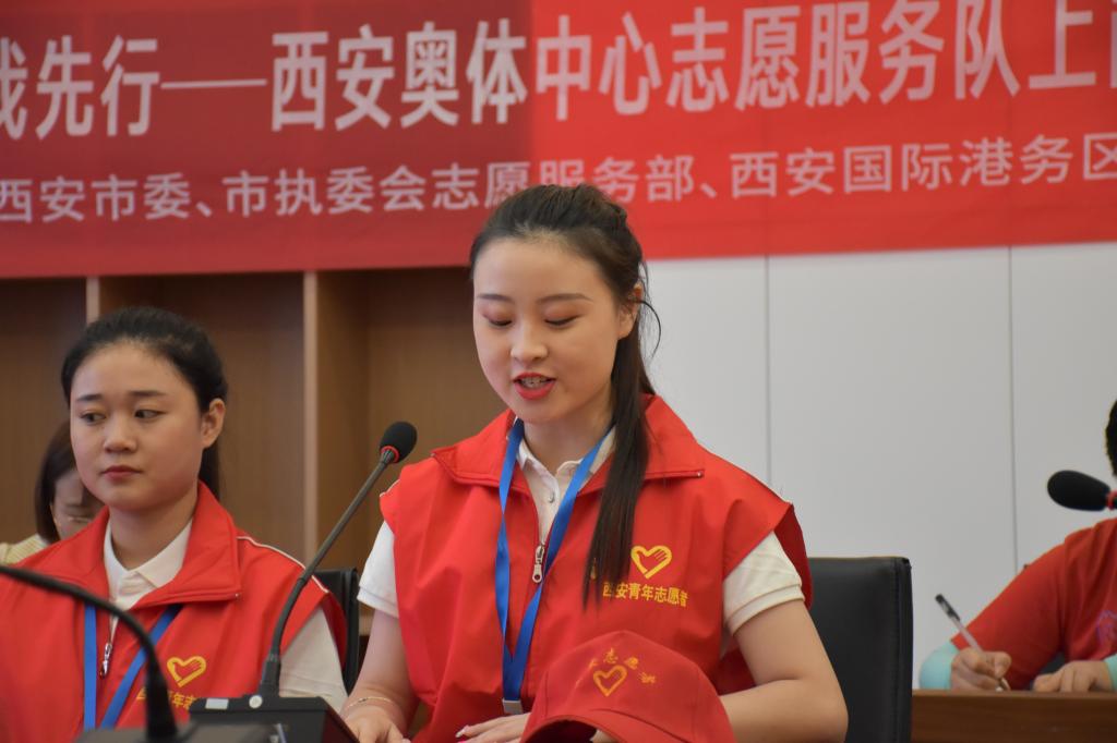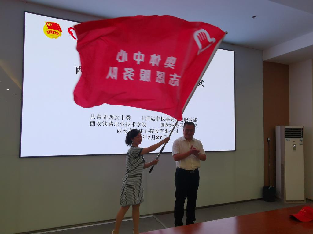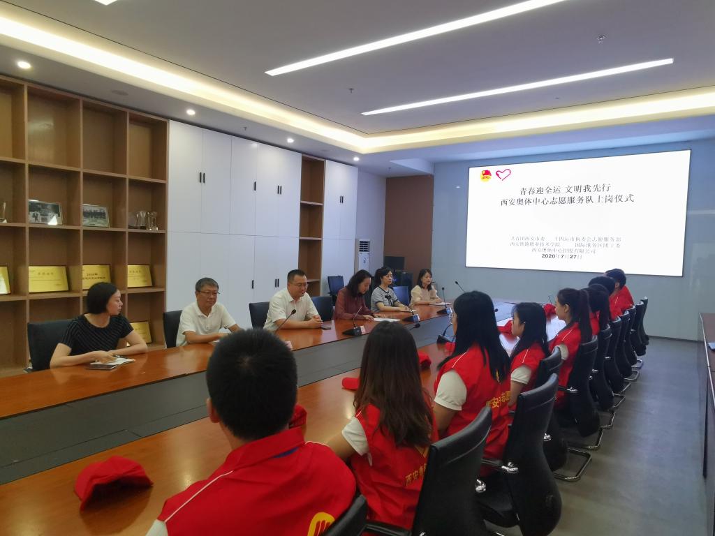 7月27日,由团市委、十四运西安市执委会志愿服务部联合纽约国际官网共同成立的首支西安奥体中心志愿服务队上岗仪式在西安奥体中心举行。团市委副书记、十四运西安市执委会志愿服务部驻会副部长徐辉、华润置地西安体育会展平台公司常务副总经理周晓明、西安国际港务区组织人事局局长韩婷婷、纽约国际官网团委副书记李妮与纽约国际官网15名志愿者参加上岗仪式。