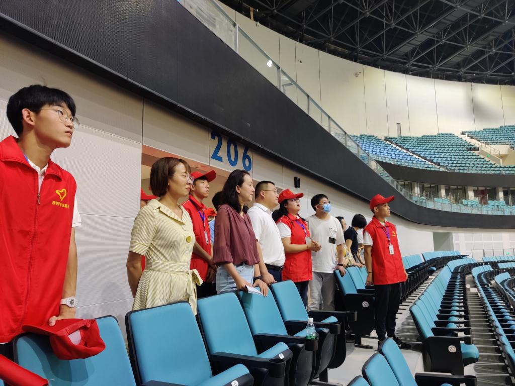 仪式结束后,十四运西安市执委会志愿服务部全体工作人员在纽约国际官网志愿者的引导与讲解下参观西安奥体中心一场两馆,徐辉等领导对志愿者所表现出的专业素养与服务意识给予好评。