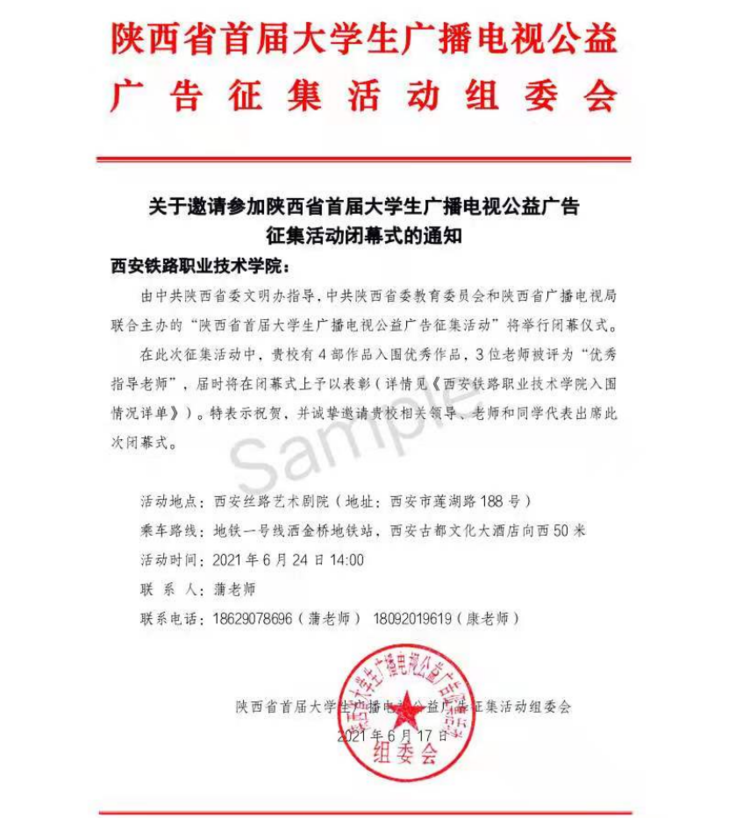 6月24日下午,由中共陕西省委文明办指导,中共陕西省委教育工作委员会和陕西省广播电视局联合主办的陕西省首届大学生广播电视公益广告作品征集活动闭幕式在西安丝路艺术剧院举行,学院党委学生工作部部长郭小莉、副部长高阿联以及四名学生代表应邀参加了闭幕式。