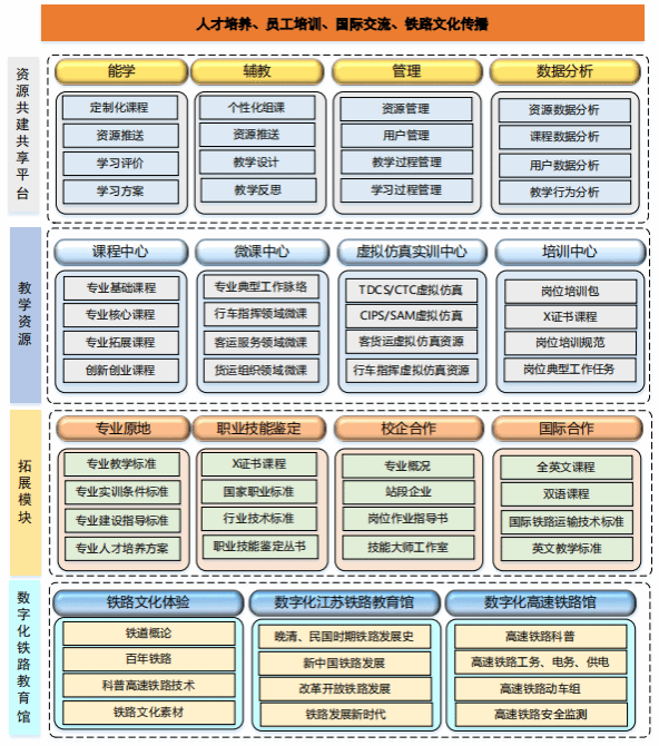 铁道交通运营管理专业教学资源库按照“1441”整体架构建设。建成“一个平台”(资源共建共享平台)、“四大中心”(课程中心、微课中心、虚拟仿真实训中心、培训中心)、“四大模块”(专业园地、职业技能鉴定、校企合作、国际合作)和一个数字化铁路体验馆,实现服务人才培养、员工培训、国际交流与铁路文化传播的四大功能。