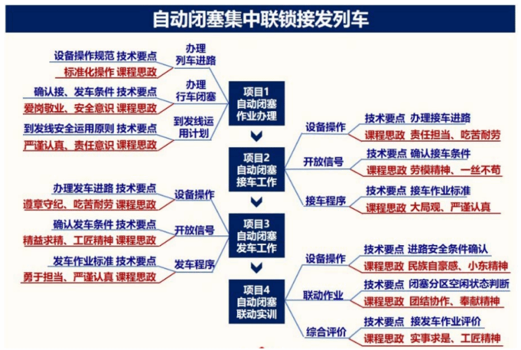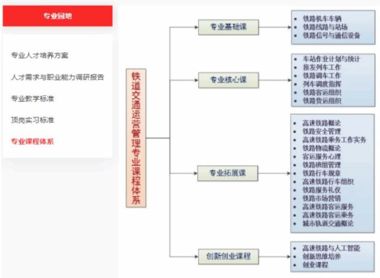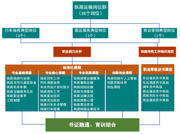 依据国家专业教学标准,对接关键岗位职业标准,根据本专业面向的38个岗位作业内容及特点,划分行车指挥、客运服务、货运组织三大岗位群,析取车站值班员等6个典型工作岗位,一体化开发专业标准化课程,职业培训课程。