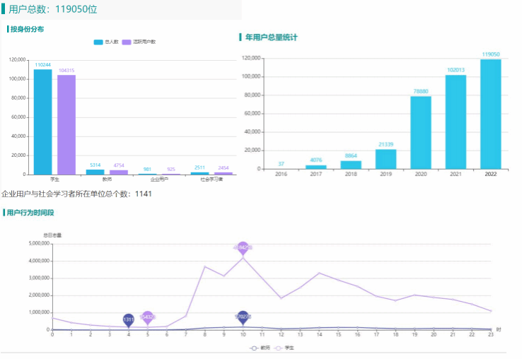 遵循“边建边用”的原则,在建设过程中,加强资源库的推广和应用。截至2022年9月, 注册用户达到119050人,累计访问量达4778万次,最高日访问量达417万次。活跃用户人数达到110795人,占比94.4% 。用户覆盖了全国31个省区的1420家院校,1141家企业单位, 近3年,用户总量年均新增30%。