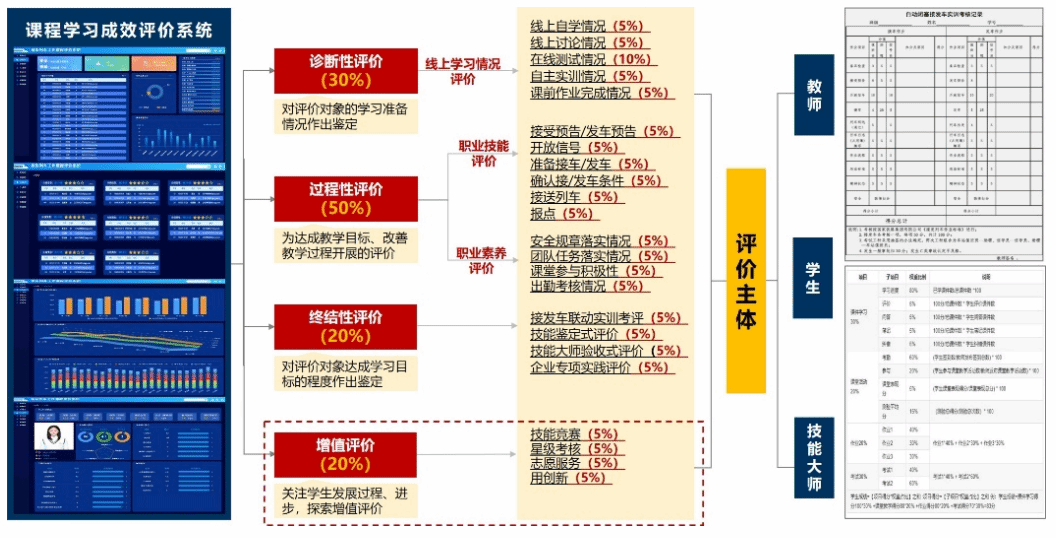 推动课程评价方式改革。依托资源库教学平台,应用线上学习行为数据,推动课程评价方式改革,在专业核心课程的教学中,推行“多元多维”综合评价,评价主体多元构成,评价过程包括诊断性、过程性、终结性评价环节,积极探索实施增值评价。