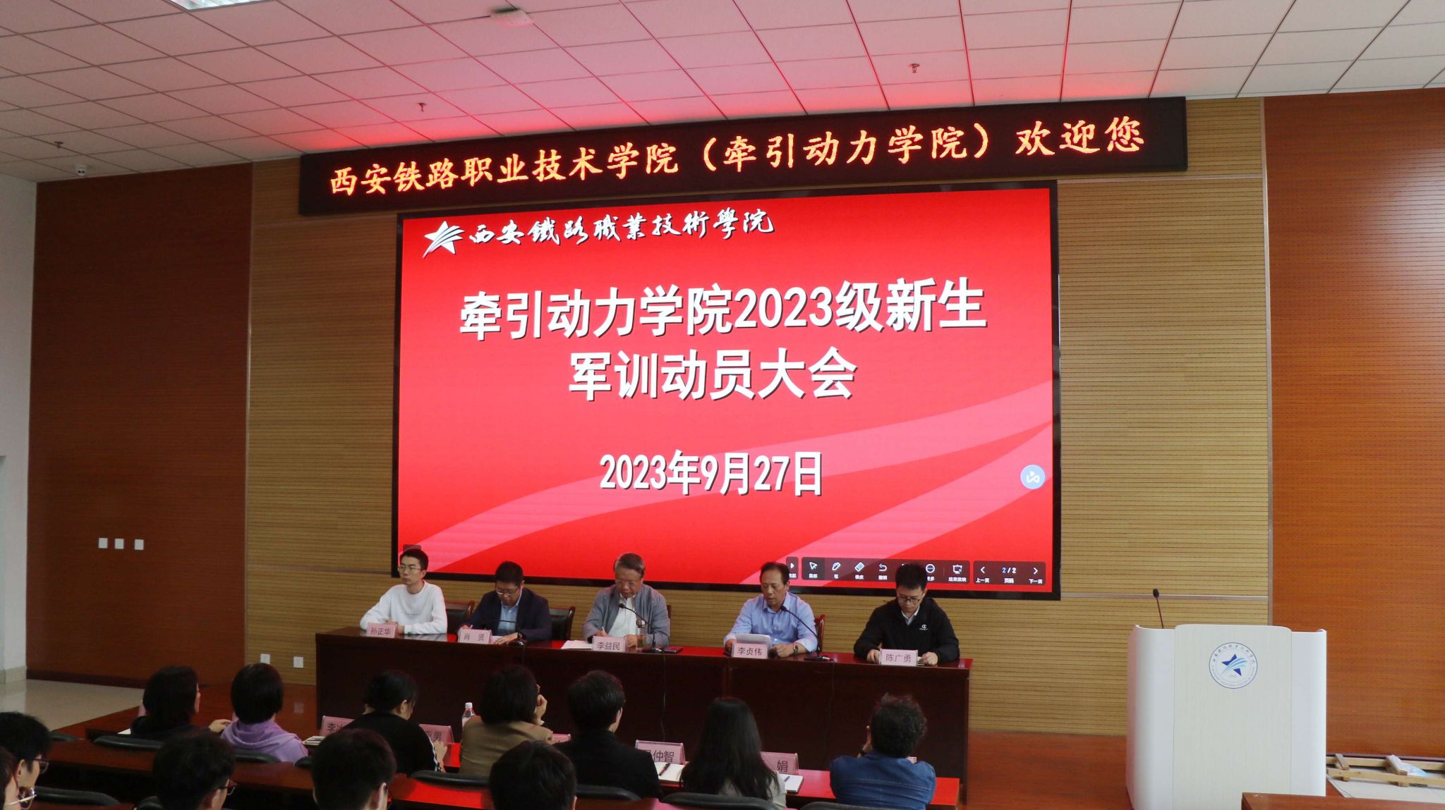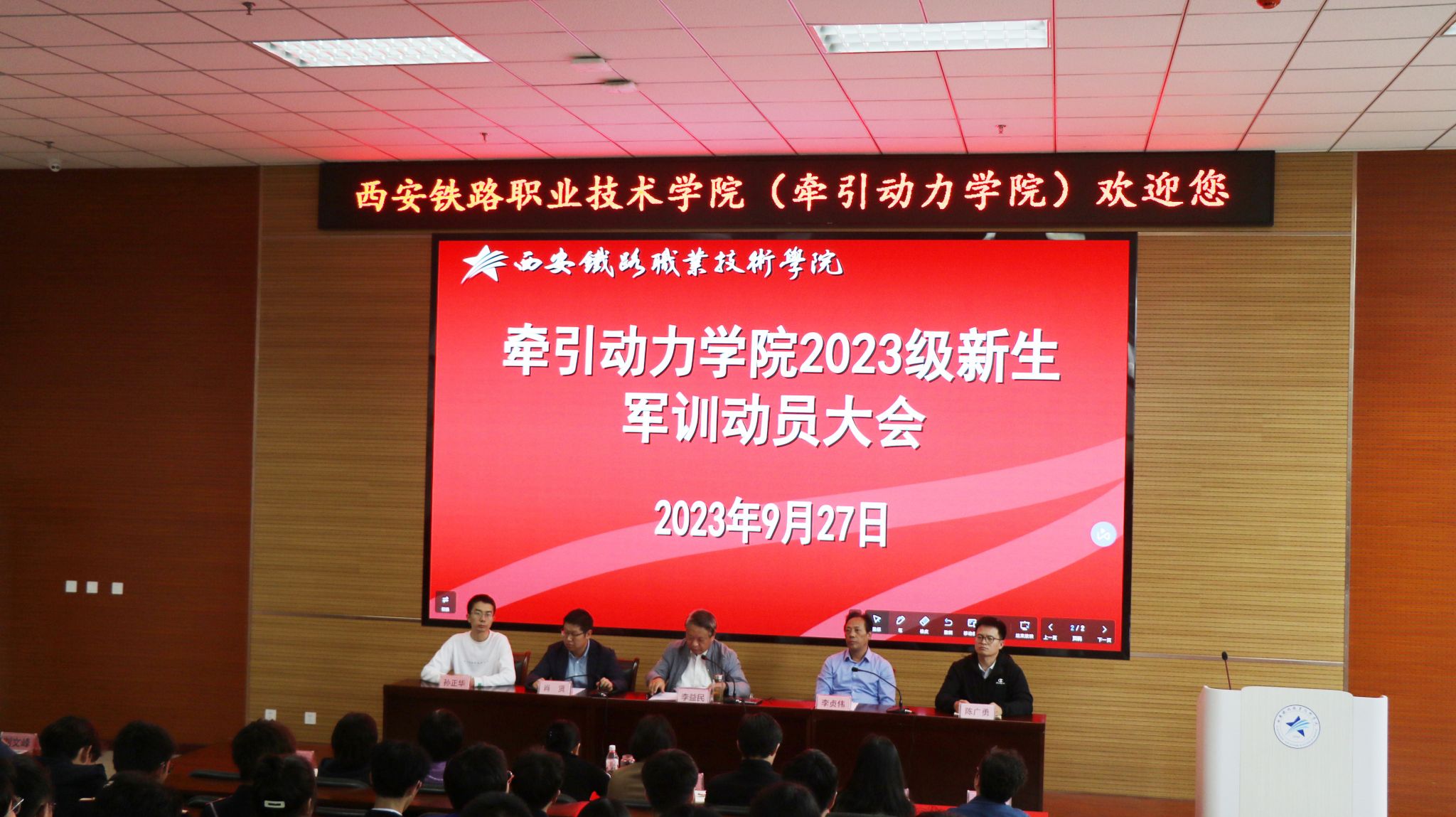 为确保新学期新生军训工作的顺利开展,9月27日下午,牵引动力学院在一楼阶梯教室采用现场直播的方式对2023级17个班开展了军训动员大会,牵引动力学院院长李益民、党总支书记李贞伟、办公室主任肖贤、学工办主任陈广勇、办公室副主任孙正华参与了此次动员大会。办公室主任肖贤主持动员大会。