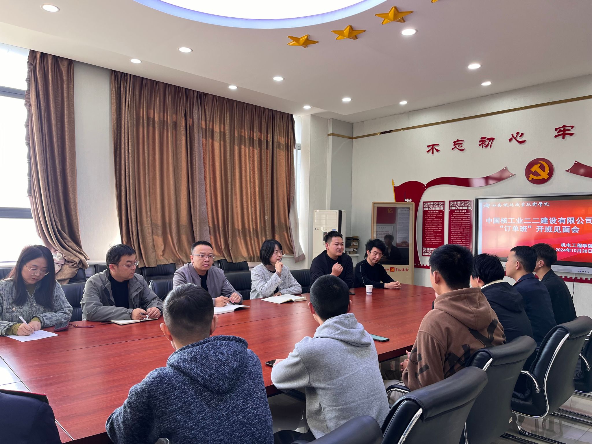 10月28日下午,机电工程学院与中国核工业第二二建设有限公司校企联合培养“订单班”开班仪式暨见面会在机电工程学院701会议室举行。中国核工业第二二建设有限公司陕西校企合作专项对接老师王琛、机电工程学院党总支书记张秀红、副院长郭峰、学工办主任谷茂庆及毕业班辅导员、2025届“中核二二”订单班全体同学共同参加了见面会。