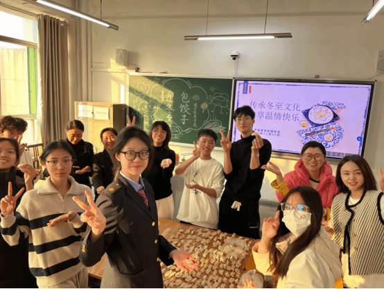 冬至是二十四节气之一,也是一个重要的中国传统节日。在这个寒风与暖阳并存的日子里,手捧一碗热乎乎的饺子,冬至才会更有滋味。为弘扬中华优秀传统文化,传递美好祝福,汉城社区立心书院电子信息学院团总支的同学们于2024年12月20日在教学楼601开展一场“传承冬至文化,共话温情快乐”的活动。
