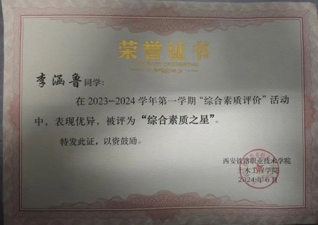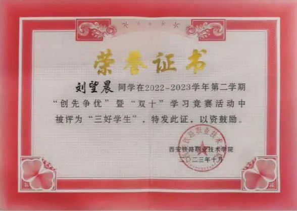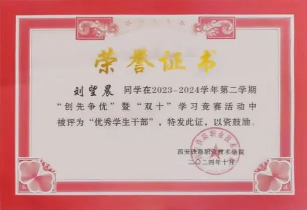 刘望晨,土木工程学院工程造价专业2201班学生,中共预备党员。在校期间担任团委秘书长,团委学生社团联合会主席。荣获三好学生、优秀学生干部、优秀共青团员、优秀共青团干部等荣誉;参与了学院组织的西安局安康段巴山工务车间“三下乡”活动,迎新生志愿者等活动。