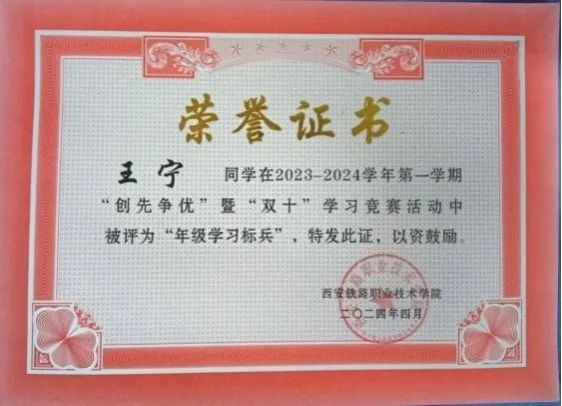 王宁,土木工程学院建筑工程技术专业2302班学生,共青团员。在校期间努力学习,上一学年个人成绩专业第一,担任班级学习委员,学生会心理部部长。荣获国家励志奖学金、三好学生、年级学习标兵、优秀共青团员等荣誉。善于沟通、乐于帮助同学、随机应变能力强,在校期间积极参与组织学院开展的各类活动。