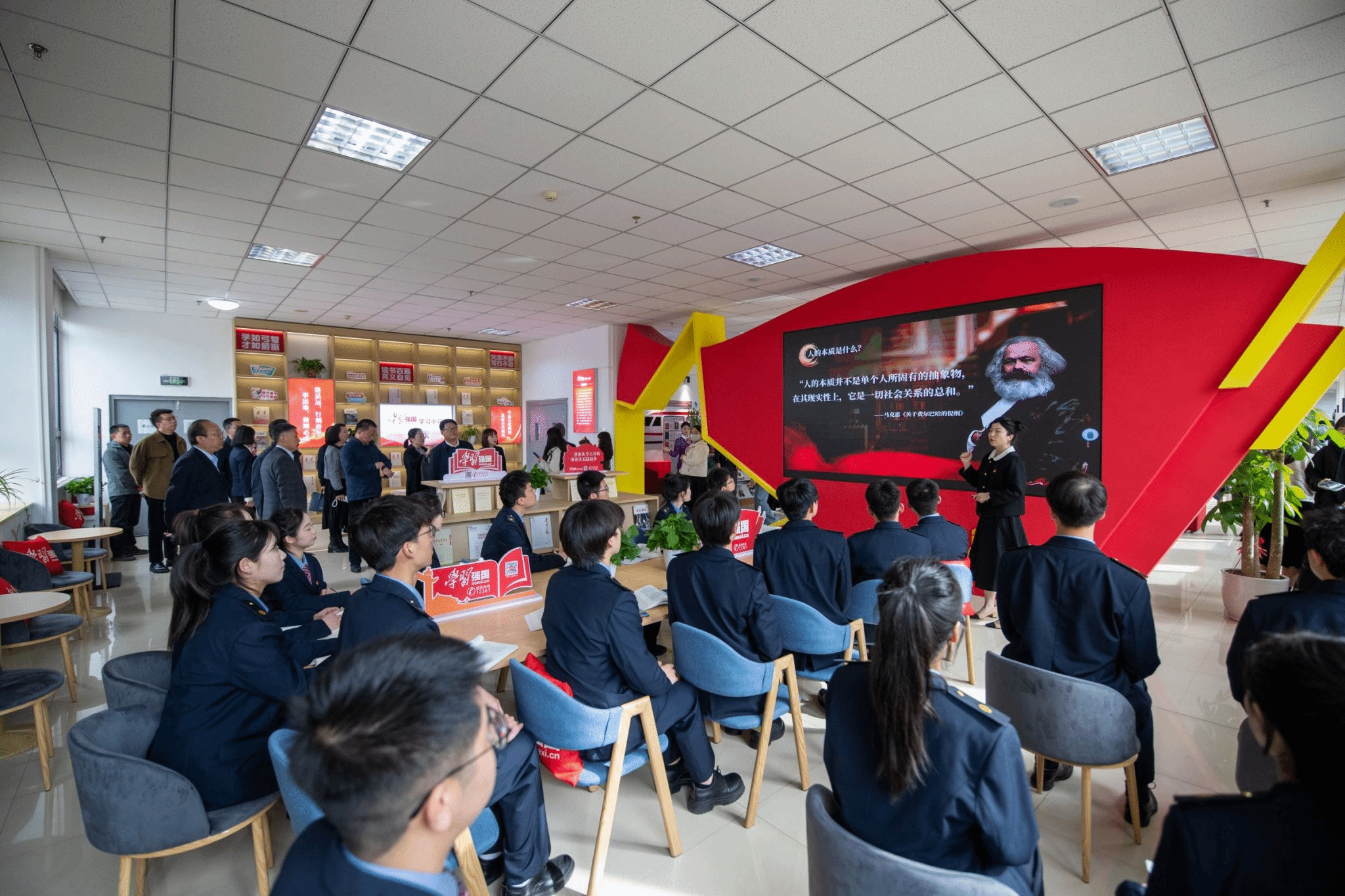 图书馆副馆长、学习强国管理员马建萍向各位嘉宾介绍了图书馆馆藏资源,并引导大家通往二楼的红色阶梯,红色阶梯用醒目的红底将中国共产党一大至二十大召开的时间、地点、历史意义标示出来,嘉宾们对图书馆充分将党史教育贯穿在文化育人的细微之处给予了高度评价。在“学习强国”学习小站,嘉宾们观看了思政课教师现场授课场景。随后,在图书馆一楼参观了传统文化阅读空间、廉洁文化阅读空间、AI智阅空间等特色空间等。