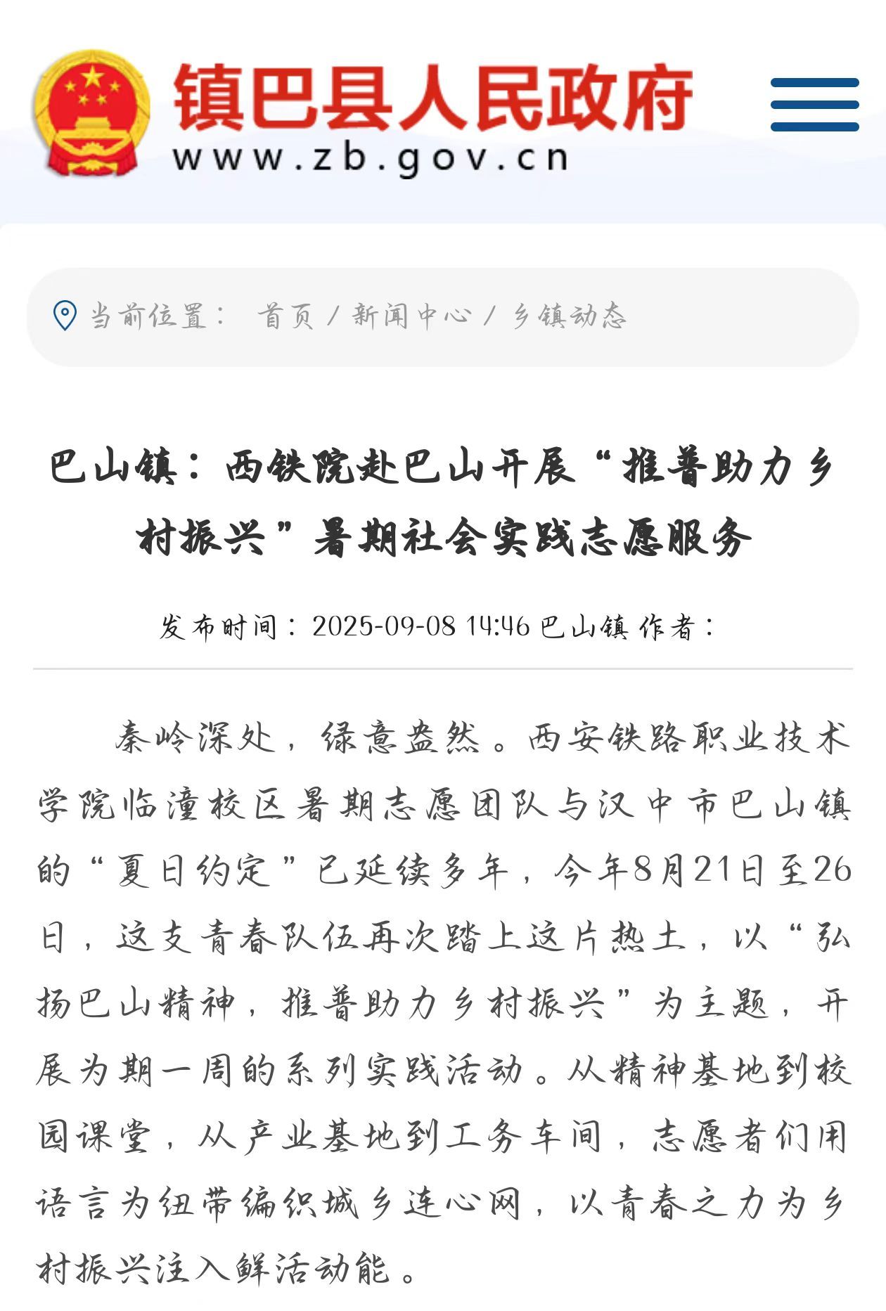 为深入贯彻教育部、共青团中央关于推普助力乡村振兴的部署要求,纽约国际最新官方网站(简称 “西铁院”)临潼校区组建师生团队,于 8 月 20 日至 27 日赴汉中市巴山镇开展暑期社会实践。自上世纪 90 年代起,西铁院便与巴山镇建立结对帮扶关系,持续开展志愿服务,累计组织师生 300 余人次,逐步构建起 “教育帮扶 + 产业助力 + 文化浸润” 的长效帮扶机制。