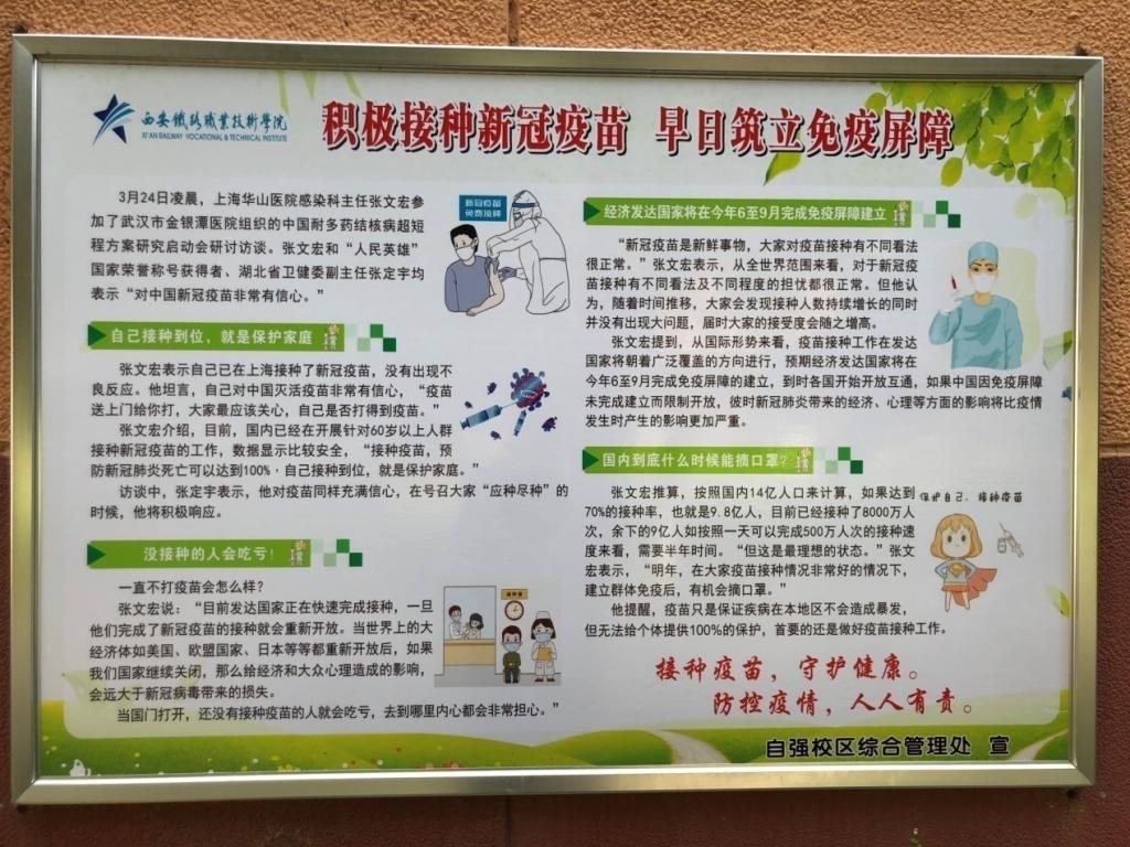 为提高自强校区全体教职工师生自主接种新冠疫苗的意识,顺利推进新冠疫苗全民接种工作。近日,自强校区综合管理处开展新冠疫苗接种宣传工作,确保校区教职工师生“应知尽知”“应接尽接”。