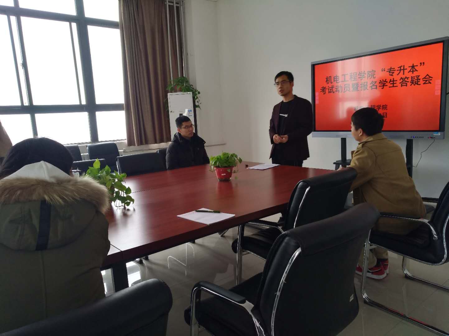 为2019届毕业生增加对“专升本”的了解,解决学生在学习中遇到的问题及困难,1月4日,机电工程学院召开“专升本”考试动员暨报名学生答疑会。会议由该院辅导员王凯主持。