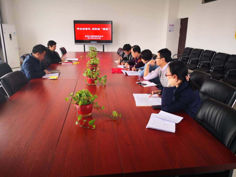 3月22下午,机电工程学院党总支在机电教学楼701会议室,召开题为“两会送春风 高职迎‘暖春’”学习两会精神会议。会议由党总支书张雅兰主持,总支委员、各支部委员参加会议。