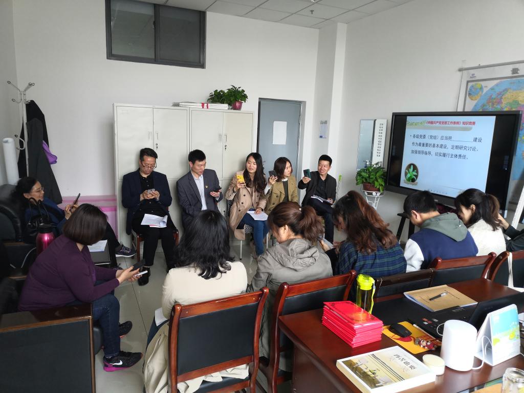 为全面落实党中央关于党员教育管理工作要在提高质量上下真功,增强针对性和有效性,切实防止形式主义,坚持“三会一课”、主题党日、集中培训等基本制度,使党员教育管理有力度有温度,加强改革创新,提高党员教育管理工作现代化水平的总体要求。4月3日下午,思政党支部在思政部办公室召开全体党员大会,开展“《中国共产党支部工作条例》知识竞赛”主题党日活动。本次活动由思政党支部书记赵建英主持。
