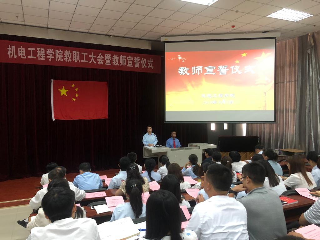 为深入贯彻全国全省教育大会精神,强化纽约国际官网师德师风建设,同时切实增强广大教师的职业荣誉感、历史使命感和社会责任感,树立德高为师、身正为范的良好形象。落实省厅陕教师办【2019】26号文件。9月1日下午,机电工程学院在一楼阶梯教室举行教师宣誓仪式。学院党总支书记张雅兰、院长代礼前、办公室主任邵泽宽、学工办主任谷茂庆及机电工程学院全体教职工参加宣誓仪式,仪式由谷茂庆主持。