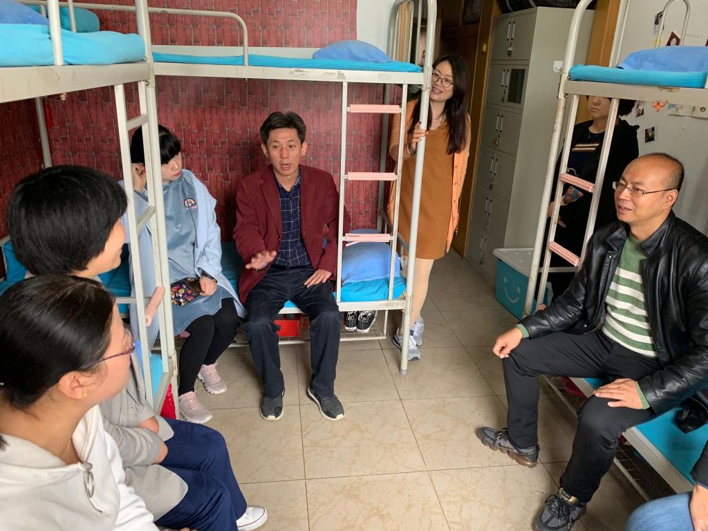 仵崇智详细查看了宿舍的卫生、文化装饰等情况,与辅导员班主任老师就学生在日常学习、宿舍卫生、物品摆放等方面进行了交流,将目前存在的四公寓过分潮湿问题和女生公寓洗嗽化妆品摆放空间小的问题作为近期努力整改的主要方向。