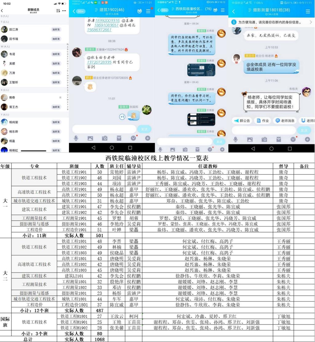 校区领导抓好“责任田”,检查教学组织工作。按照校区成立线上教学质量保障工作领导小组的责任要求,四位处级干部每人包抓约六个班级的教学督导任务,实行线上23个教学班级的全覆盖、全过程、精细化管理,通过深入QQ群、腾讯课堂等教学群,随机检查每日实时督导教师授课、学生上课和师生互动情况,确保线上教学工作各环节组织严密、规范有序。