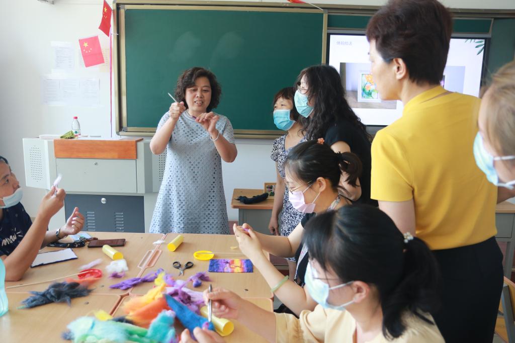面花和棉絮画传统技艺体验环节,将本次非遗传承体验活动推向高潮,在活动现场,两位传承人以代表作品为例,介绍了所传承非遗项目的悠久历史和制作工艺。按照分组,传承人对本组的参与老师当面传授祖传技艺。在场老师踊跃参加,短短的功夫,色彩艳丽的棉絮在老师们手中变成绚烂的夏花,不同颜色的面团变成蝴蝶、花朵。老师们热情高涨,在传承人的指导下亲自动手体验,收获了自己的作品,更收获了创作的欢愉,感受到中国传统文化的魅力。