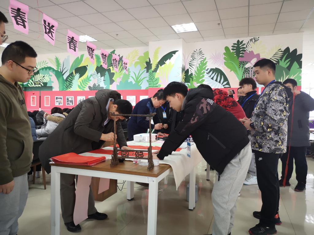 活动现场墨香悠悠,年味浓浓。师生们跃跃欲试,兴趣盎然。一边是手写春联,“无联不成春,有联春更浓”,书法大咖们泼墨如风,一副副承载着美好祝福的春联跃然纸上。“术业宜从勤学始,韶华不为少年留”、“牛主乾坤春浩荡,人逢喜庆气昂扬”、“牛年喜奏丰年乐,人世笑迎盛世春”,王树和李铭两位老师为大家挥毫送祝福,泼墨呈吉祥。“学优才赡凭修练,海阔天空任展为”、“书山有路勤为径,学海无涯苦作舟”书法协会的同学们也在气氛的感染下提笔展示。一边是图书馆老师指导并演示如何创作自己喜爱的剪纸图案。“快看,这是我剪的福字,新的一年希望自己沾沾福气,期末能有个好成绩!”董同学一边展示自己的作品一边开心地说。一把剪刀,一份热爱、一声祝福都融化在一张张剪纸里,形态各异、栩栩如生的剪纸诞生在大家的手中。
