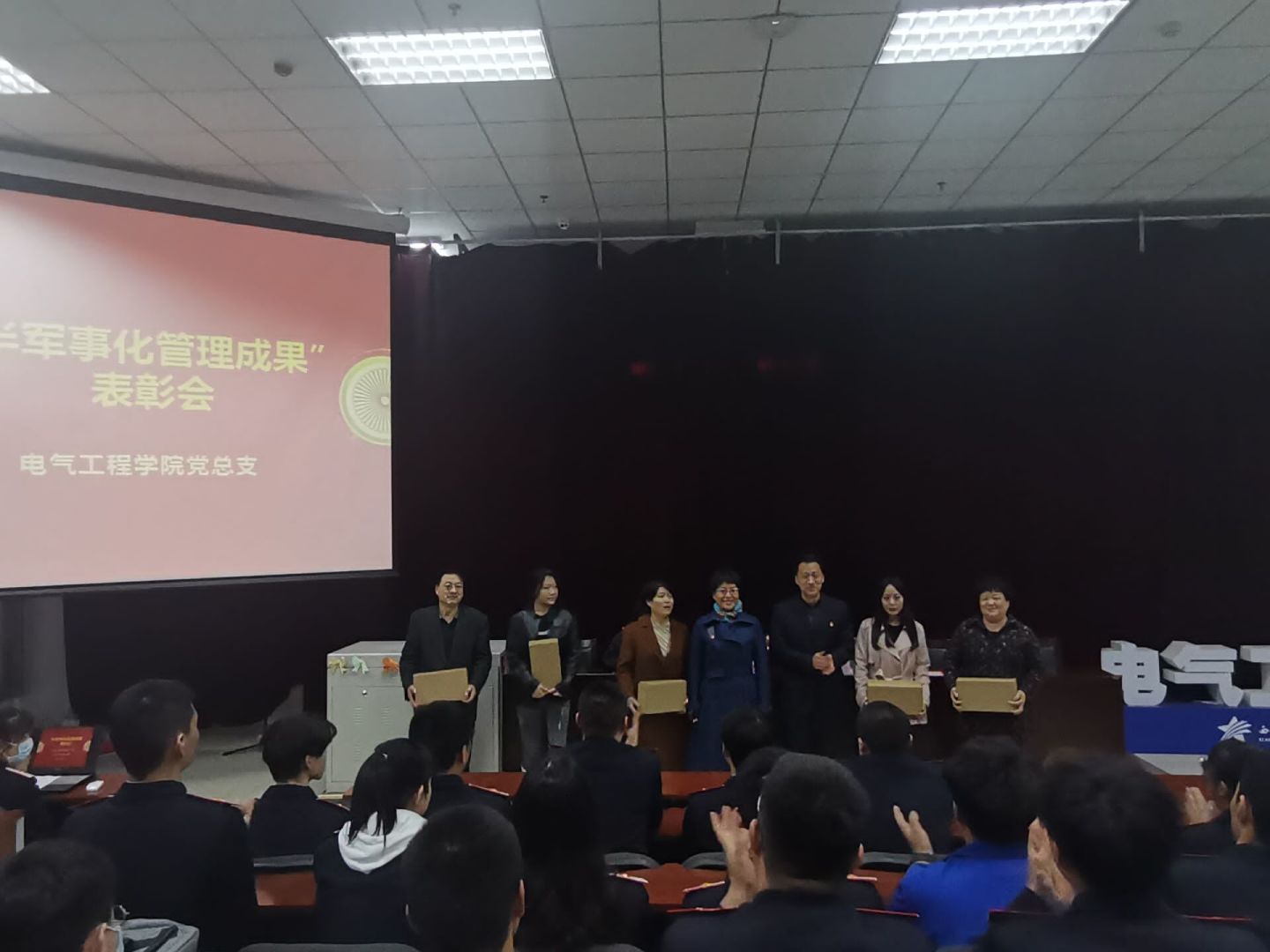 会上,学工办主任马纪宣读了《电气工程学院党总支“半军事化管理”成果表彰决定》,播放了获得学院表彰的“内务之星”宿舍照片视频,党总支书记和晋秦为获得“落实奖”的马纪主任、“督察奖”的田程琳等15名同学、“管理奖”的张春丽等5位老师、14间“内务之星”宿舍颁发了奖状和奖品。