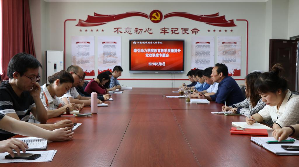 牵引动力学院5月8日中午在牵引楼701召开了教育教学质量提升党政联席专题会,牵引动力学院院长李益民、书记李贞伟、副院长林辉、各专业带头人、教研室主任、副主任、学工办主任、组织员及办公室全体人员参加了会议,会议由院长李益民主持。