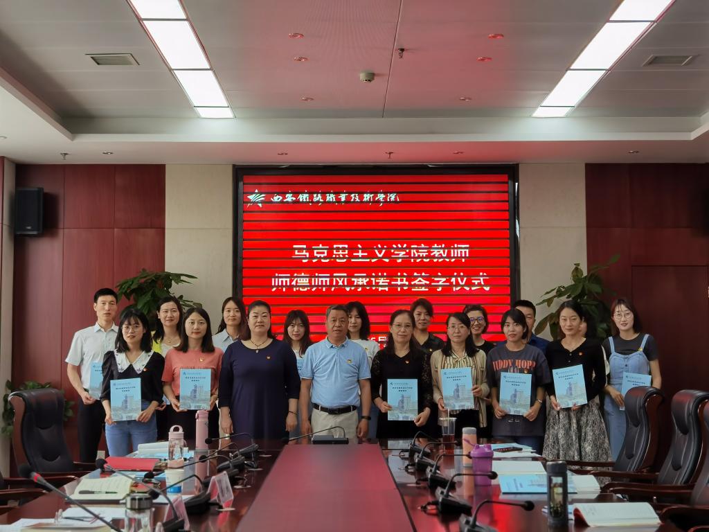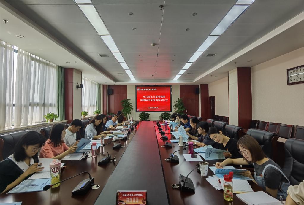 签署仪式结束后,马院全体教师集体学习了西安市教育局办公室关于转发《教育部公开曝光8起违反教师职业行为十项准则典型案例》的通知和陕西省教育厅《关于对9起违反教师职业行为十项准则典型问题》的通报两份文件。