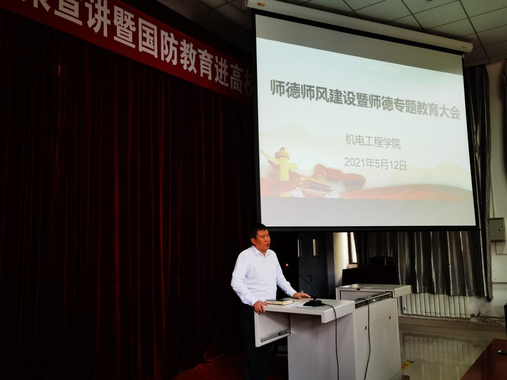 教育大会上,机电工程学院院长代礼前重申了5月7日学院5月份教学例会重点要求,强调教师要高度重视课堂组织管理,严肃学风。邵泽宽领学了西安市教育局办公室《关于转发<教育部公开曝光8起违反教师职业行为十项准则典型案例>的通知》《陕西省教育厅关于对9起违反教师职业行为十项准则典型问题的通报》。