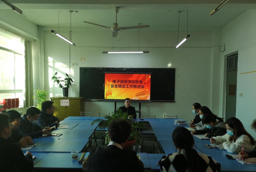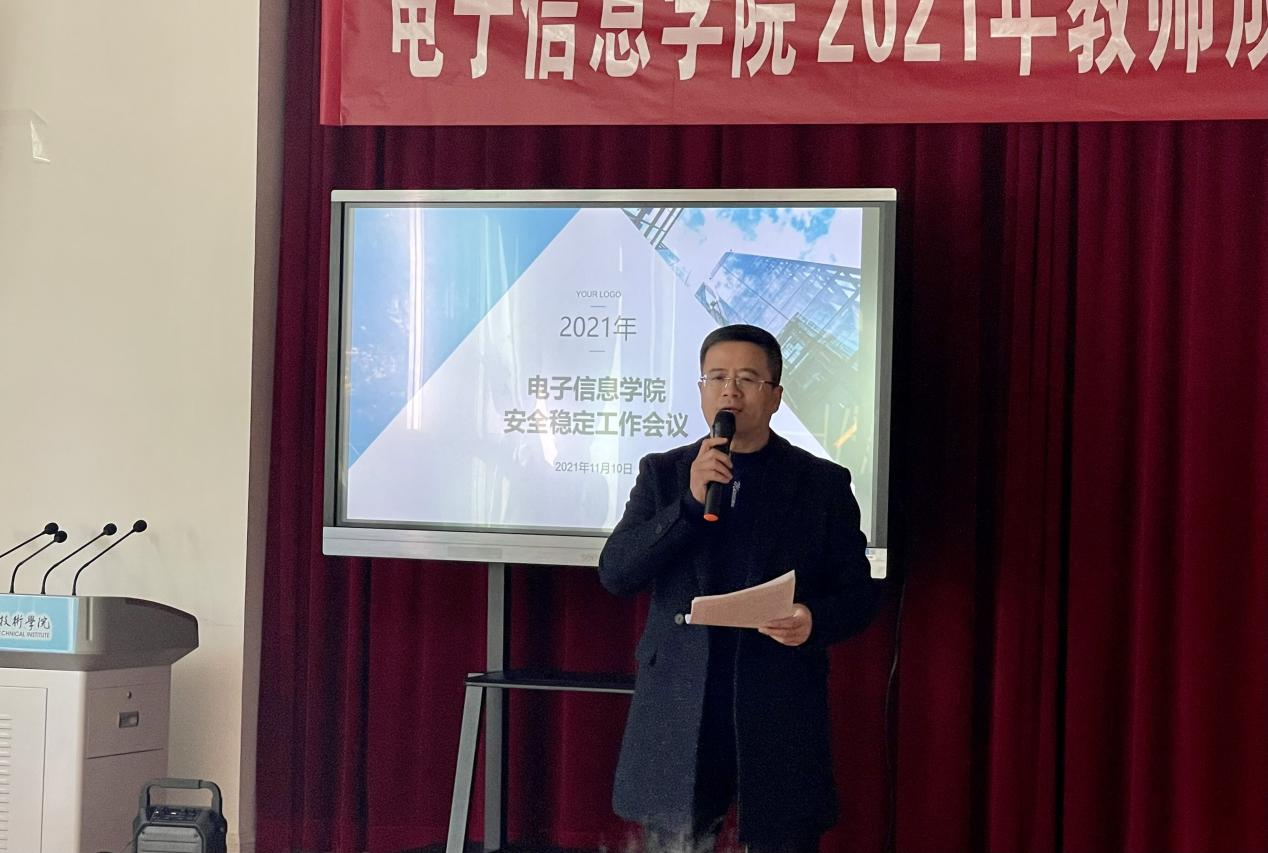 11月10日下午电子信息学院于教学楼407教室召开安全稳定专题会议。电子信息学院党总支书记张伟敏、院长董奇、副院长冯国良以及全体教职工参加此次会议。