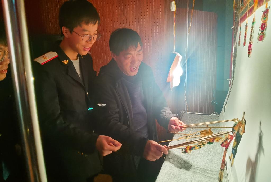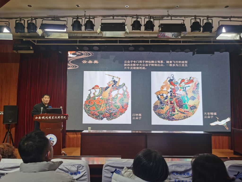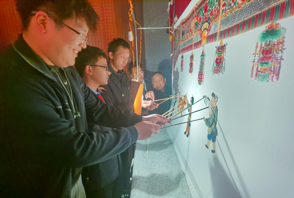 在汪天稳大师的介绍下,大家了解了陕西东路皮影雕刻技艺,欣赏了众多皮影雕刻作品,在观看作品过程中不时发出阵阵惊叹声。随后,同学们向汪天稳大师询问相关皮影雕刻艺术的问题,并亲自参与到皮影表演艺术中。最后,中国汪氏皮影艺术团的老师们为大家表演了皮影戏《猪八戒背媳妇》。