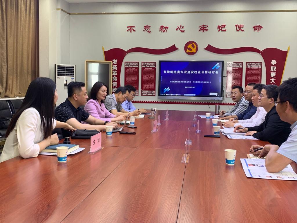 为深化校企合作,实现校企联动、协同育人,机电工程学院与西安嘉博教育科技有限公司于5月12日下午在701会议室召开智能制造类专业建设校企合作研讨会。嘉博教育总经理徐伟青、副总经理谭萌光、项目总负责李熙、职业教育专家薛万斌、总经理助理宋如,机电工程学院党总支书记张伟敏、院长代礼前、副院长郭峰、办公室主任邵泽宽、学工办主任谷茂庆以及智能制造教研室主任冯小庭等参加了研讨会。