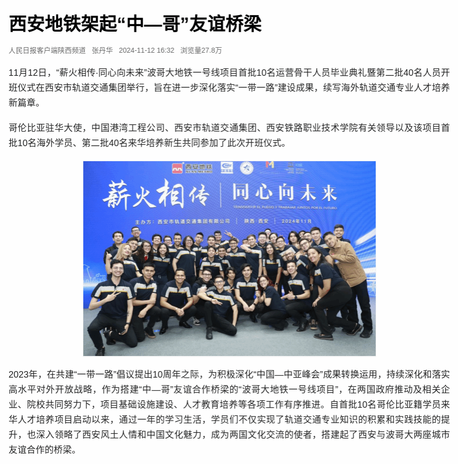 人民日报:西安地铁架起“中—哥”友谊桥梁